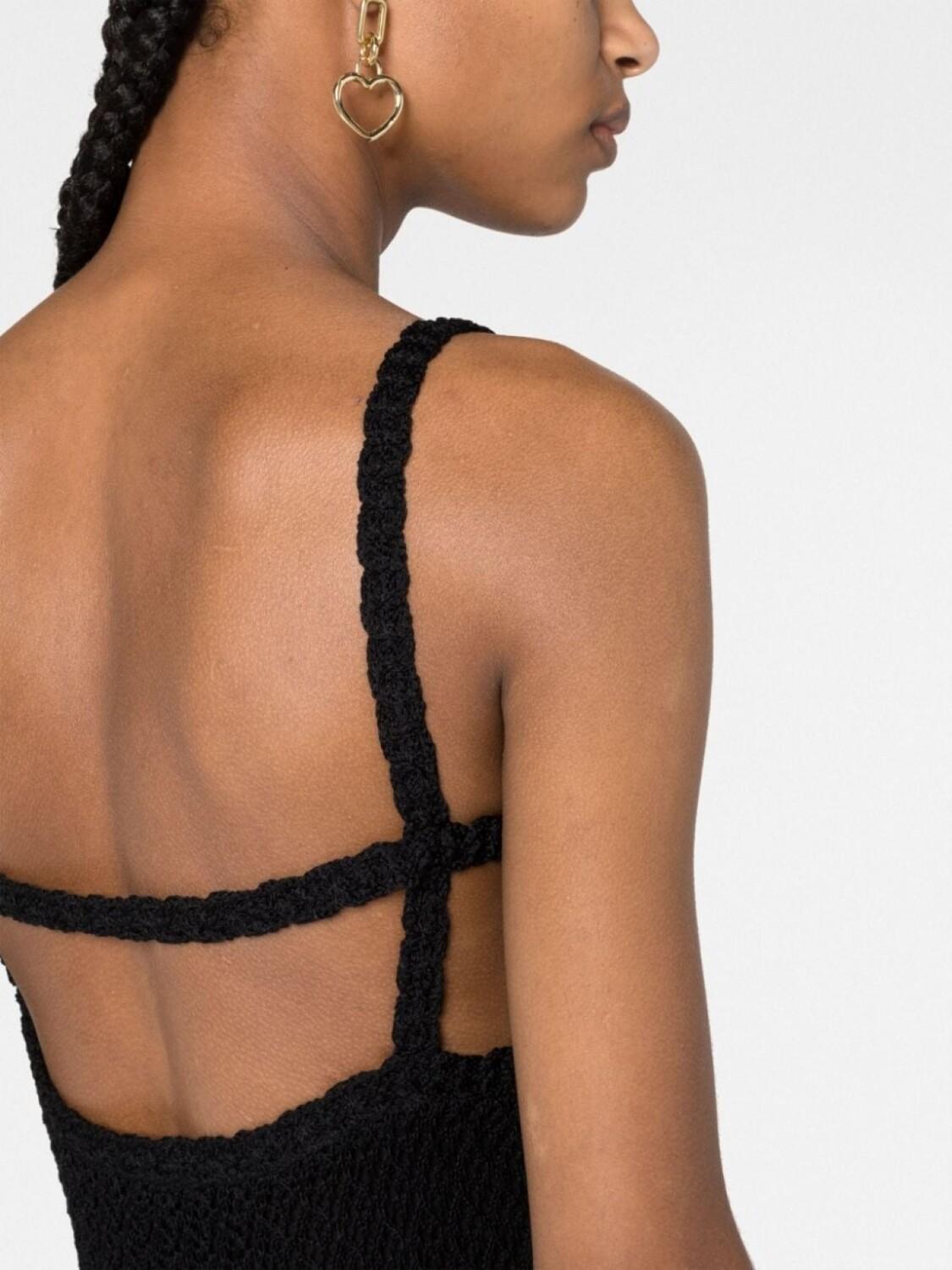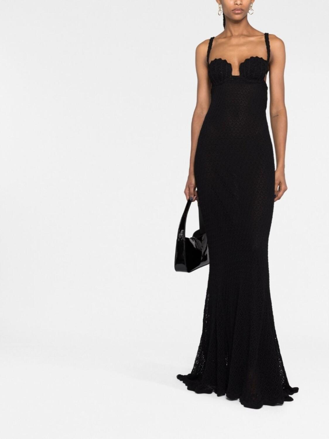 Черный, кроше, приталенный силуэт, расклешенный подол, тонкие бретели, вырез в форме сердца, низкий вырез на спине, длина макси и силуэт «русалка».