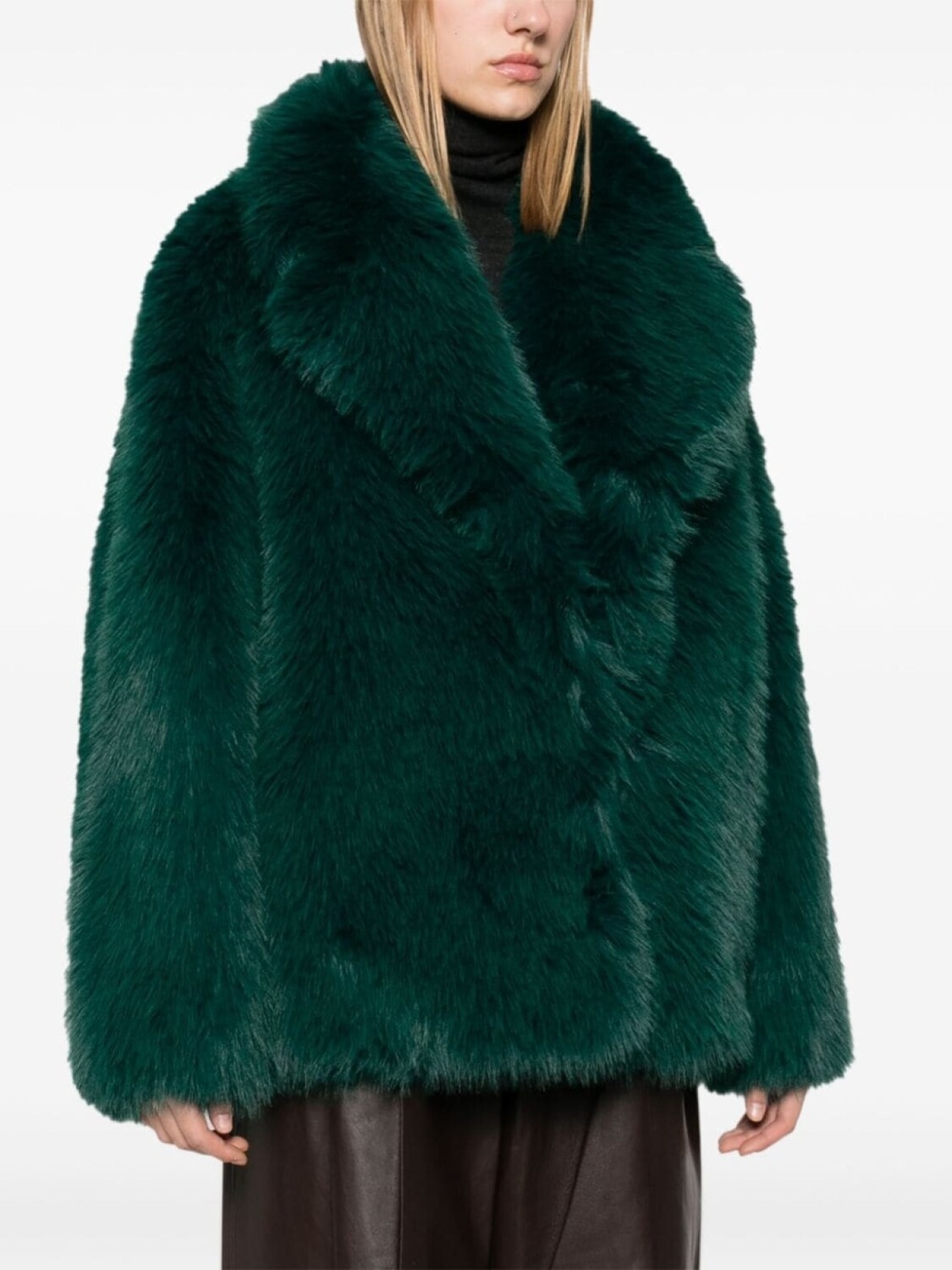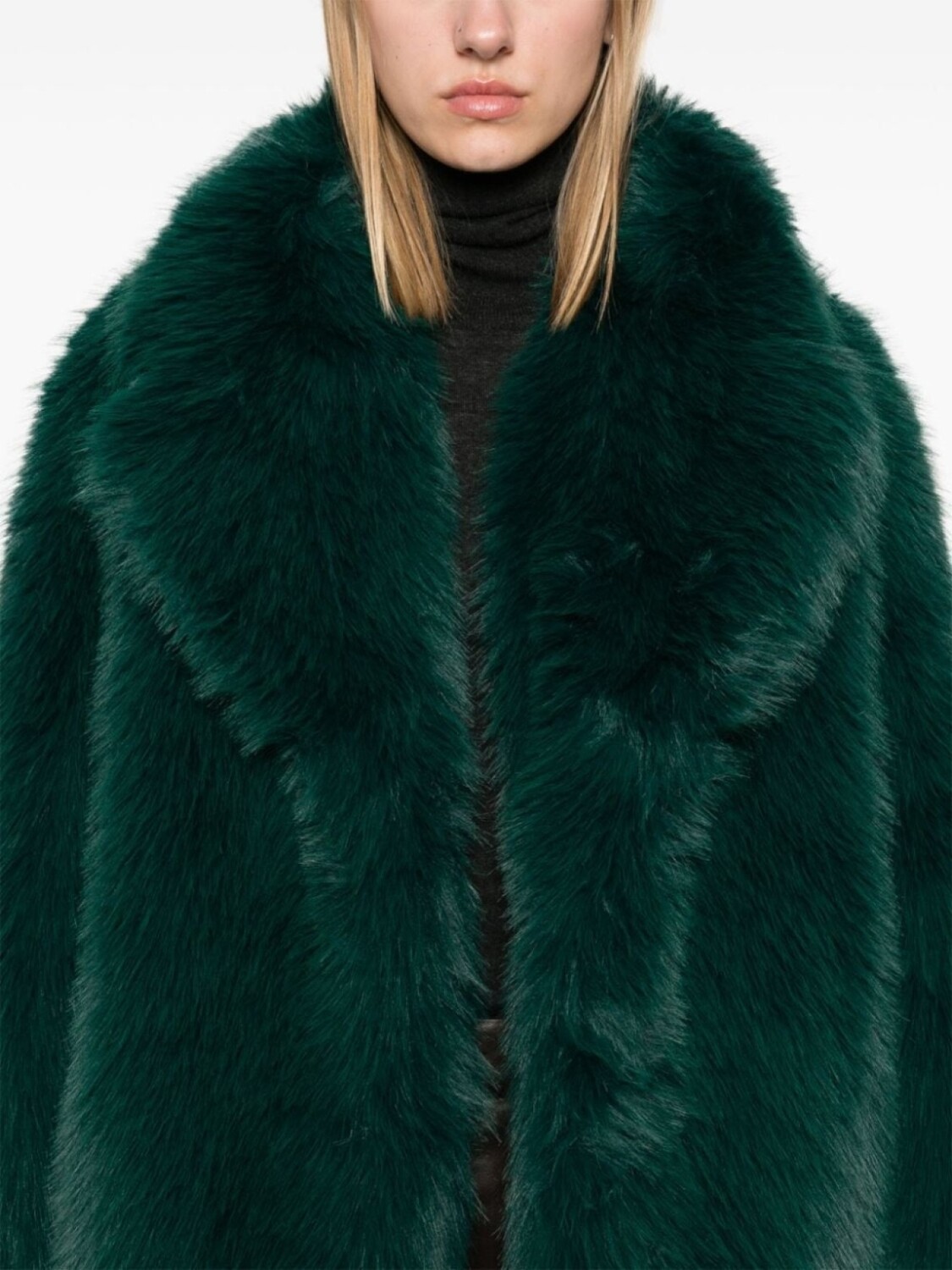 Темно-зеленый, искусственный мех, застежка на крючке спереди, широкие зазубренные лацканы, длинные рукава, два вшитых кармана по бокам, прямой подол, цельная подкладка