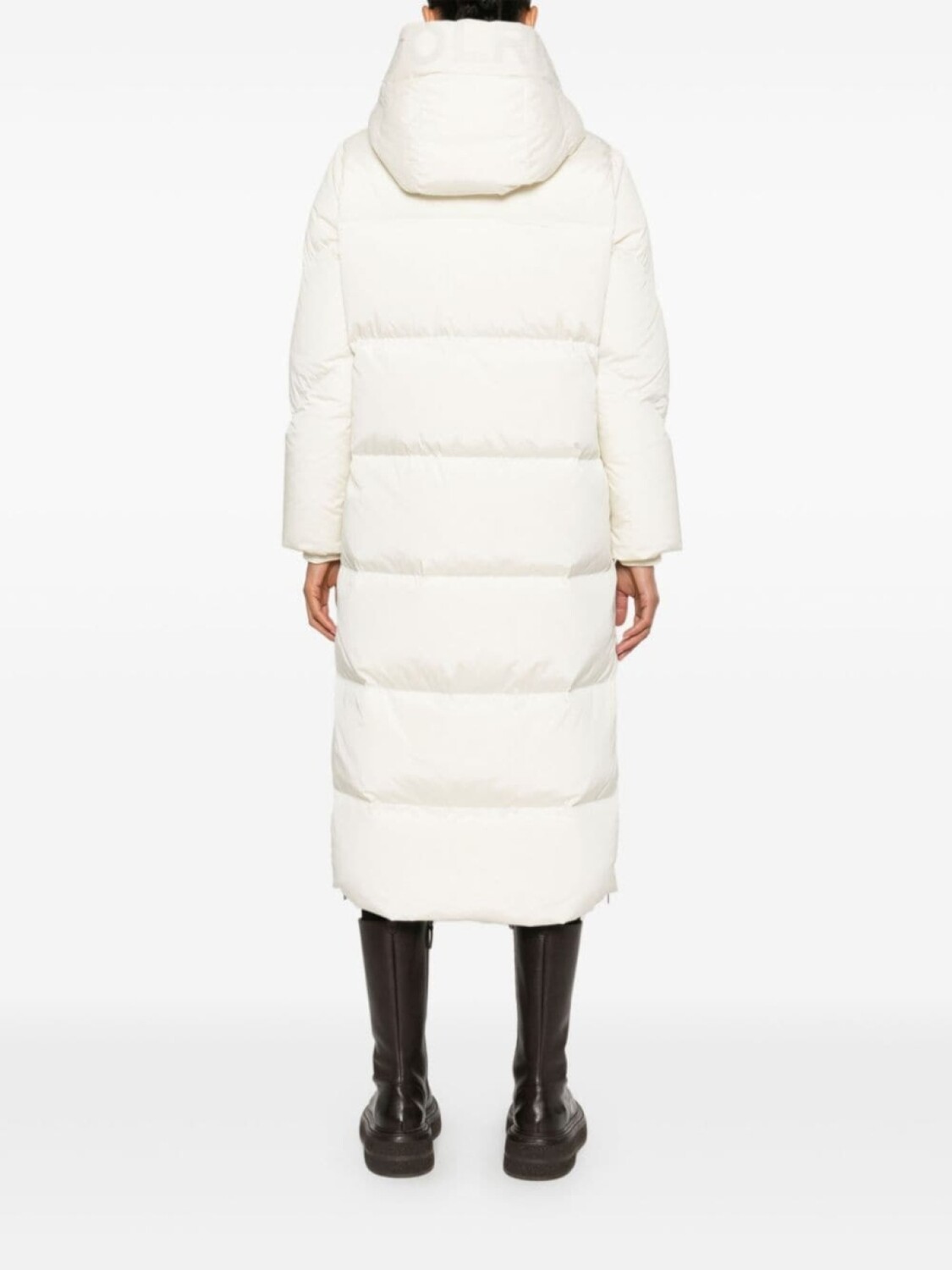 Белый, наполнитель из смеси пуха и пера, стеганная модель, двойные стенки с изоляцией, водонепроницаемая модель, застежка на кнопки и молнию спереди, затягивающийся на шнурок капюшон, высокий воротник, длинные рукава, прорезиненный логотип, манжеты в рубчик, два кармана на кнопке по бокам, застежка на молнии сбоку, логотип на капюшоне, внутренние накладные карманы, цельная подкладка, прямой подол, длинная модель