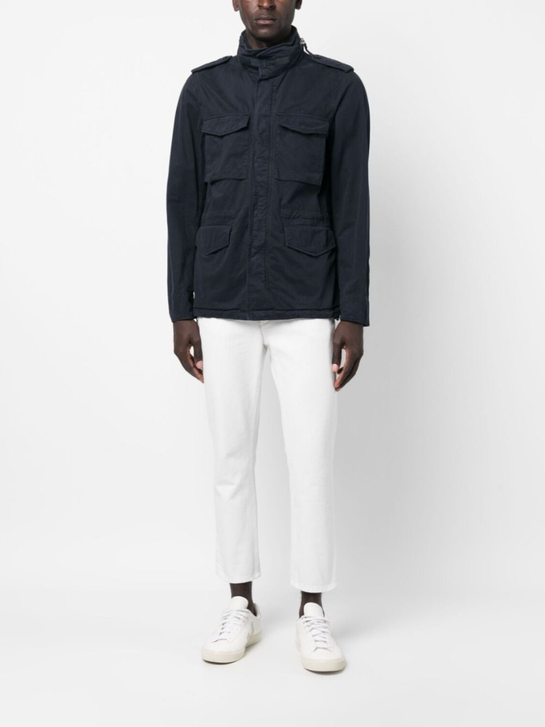 Темно-синий, хлопок, эполеты, потайной капюшон, высокий воротник, потайная застежка спереди, длинные рукава и четыре передних кармана с клапанами.