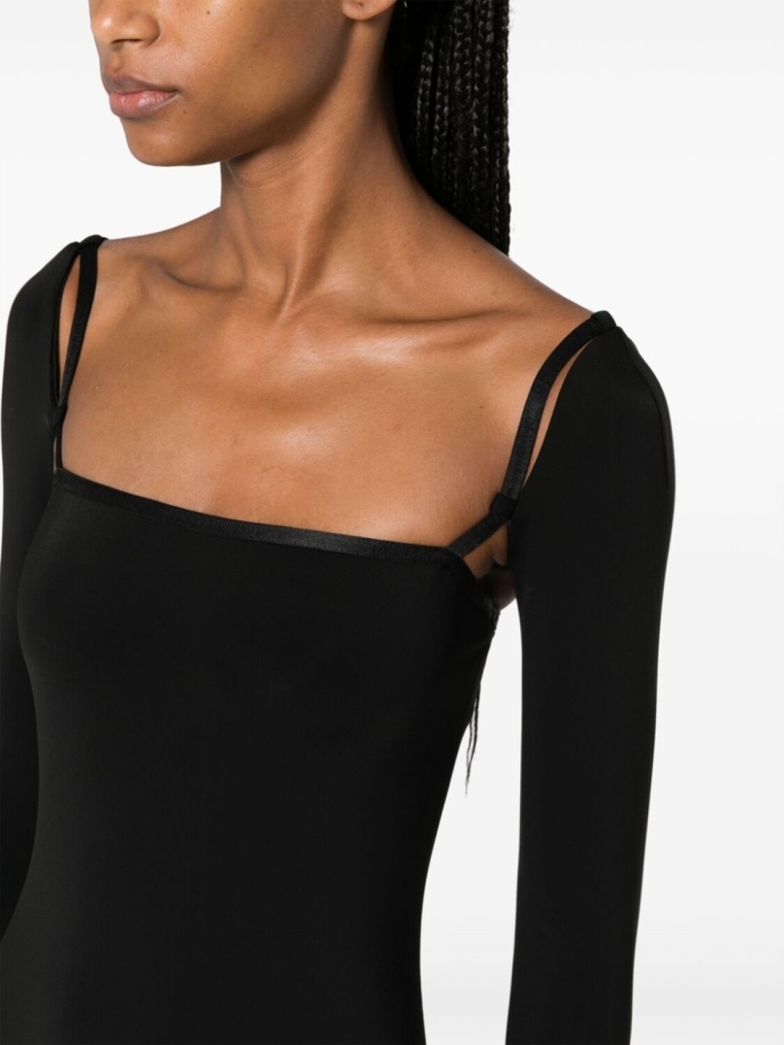 Черный, квадратный вырез, длинные рукава, регулируемые тонкие бретели и длина до бедер.