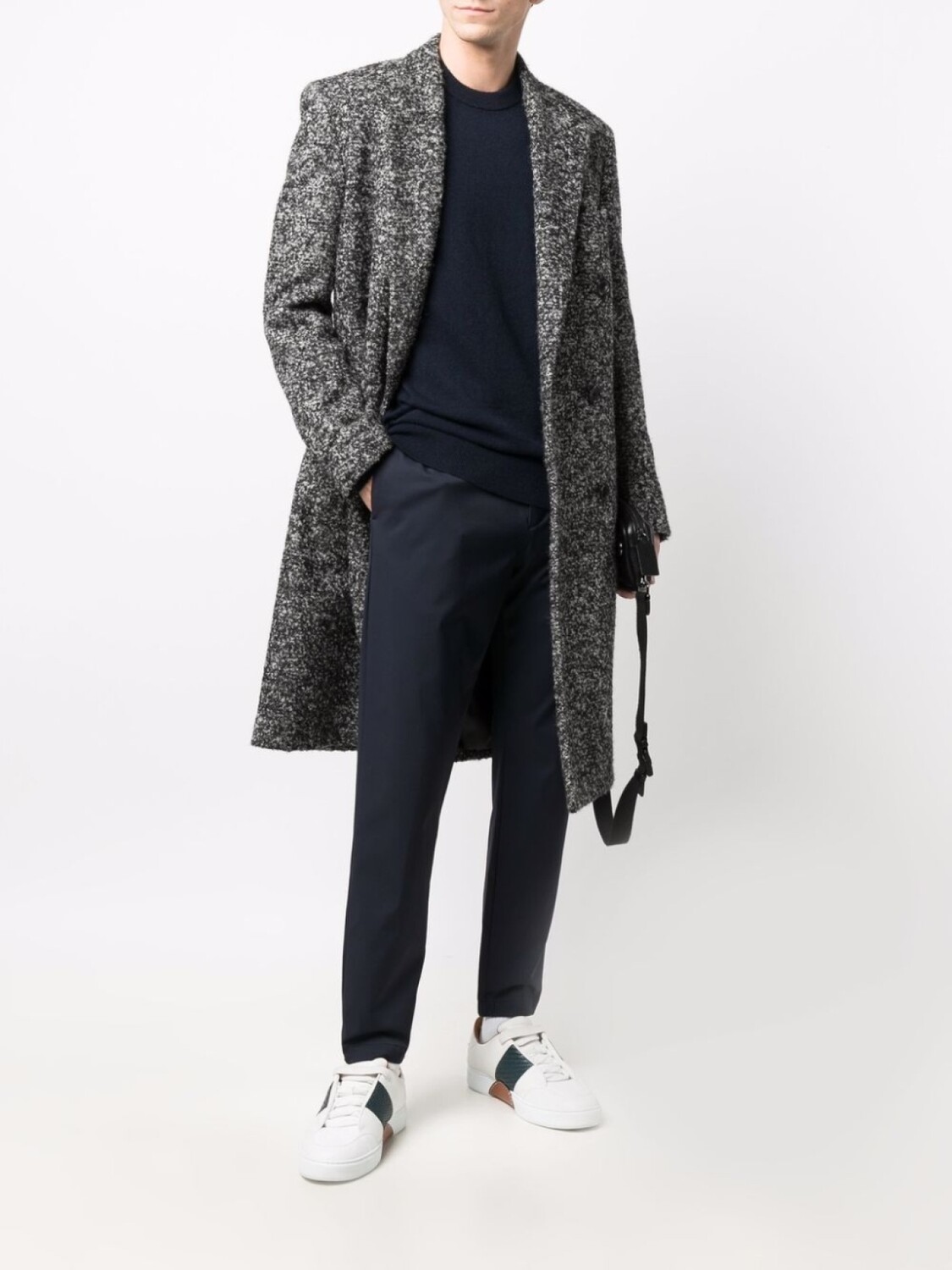 Эластичный пояс, застежка на пуговицах спереди, два прорезных кармана по бокам и два кармана с листочкой сзади.