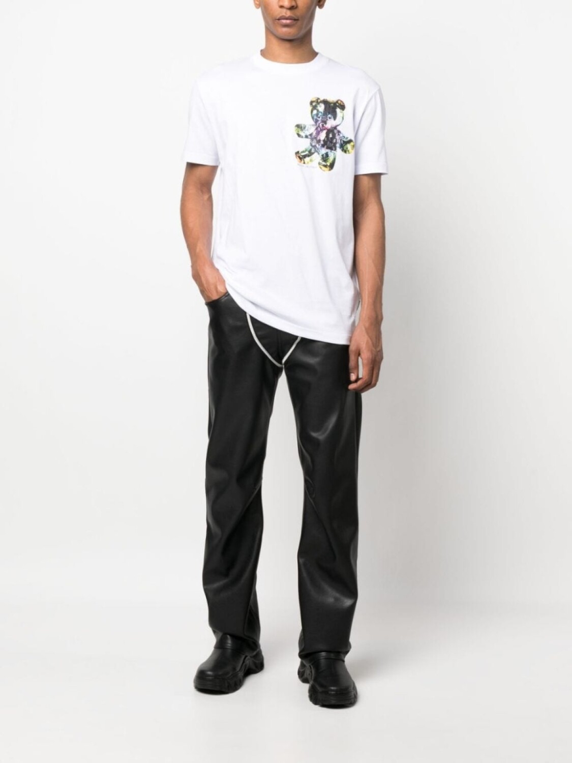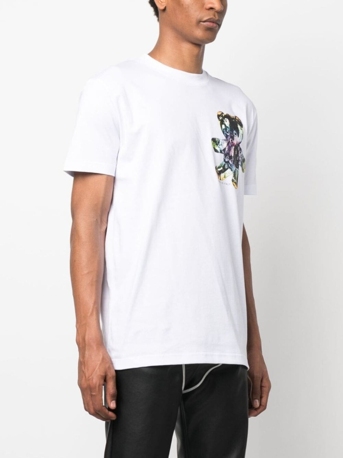 Белый, хлопок, ткань джерси, принт с изображением плюшевого медведя, нашивка с логотипом сзади, круглый вырез, короткие рукава и прямой подол.