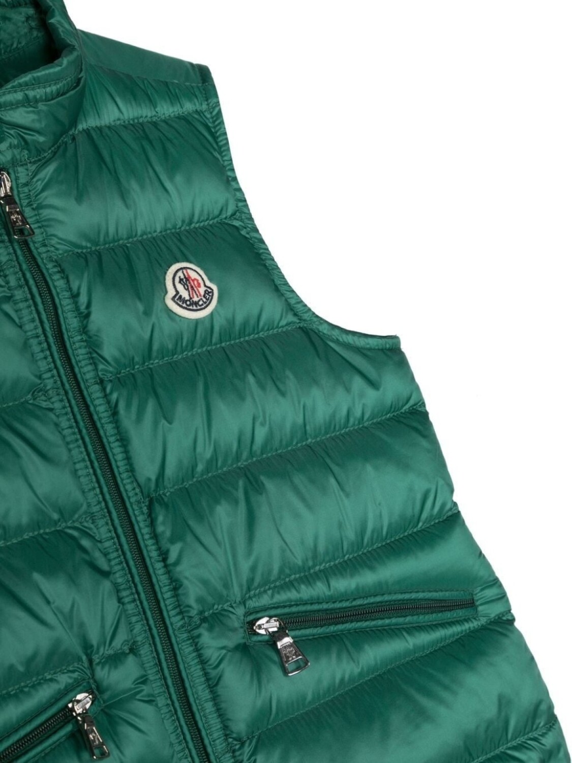 Изумрудно-зеленый, наполнитель из смеси пуха и пера, застежка на молнии спереди, нашивка с логотипом на груди, передние карманы на молнии и без рукавов.