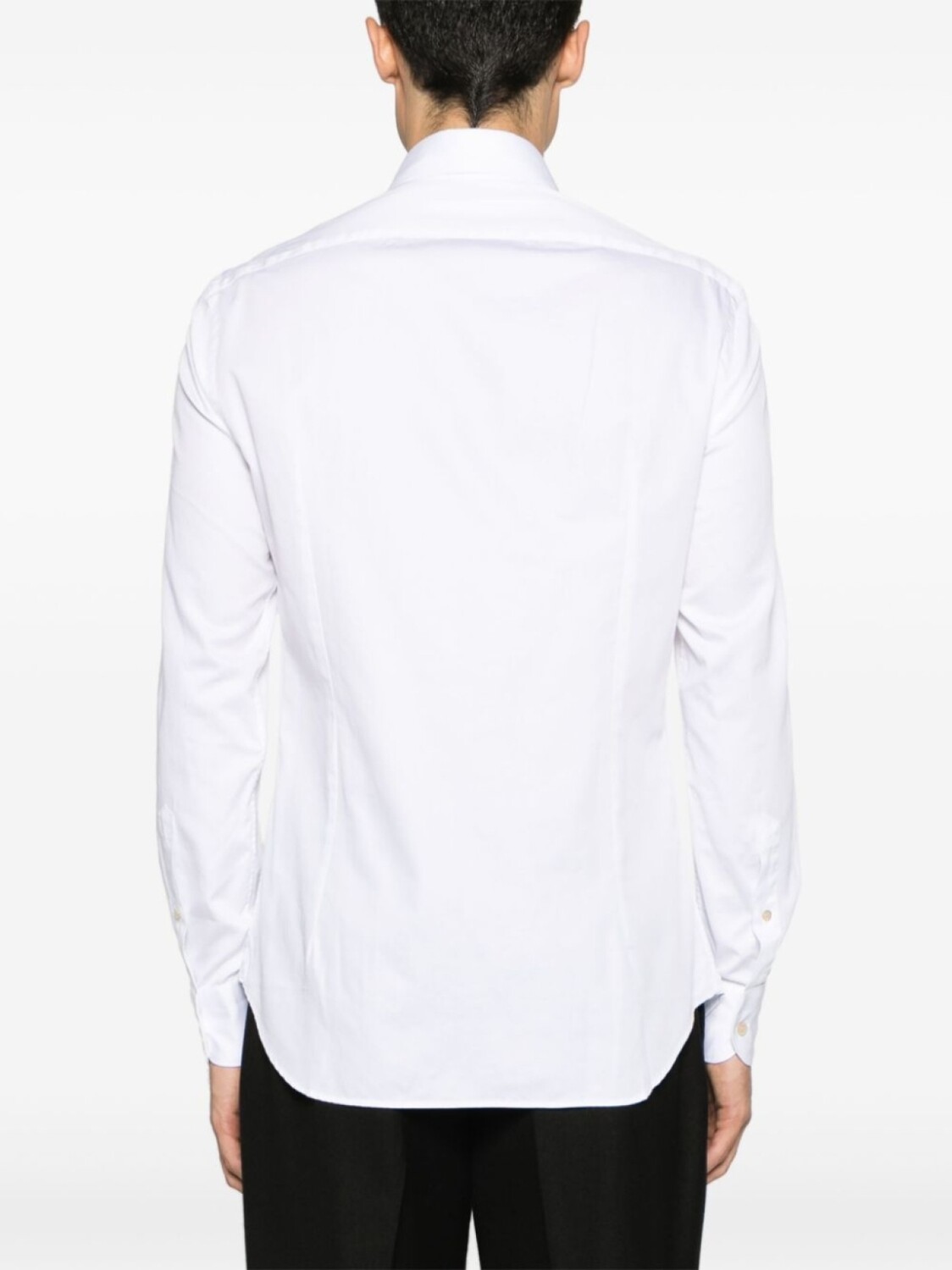 Белый, хлопок, отложной воротник, застежка на пуговицах спереди, длинные рукава, манжеты на пуговицах и закругленный подол.