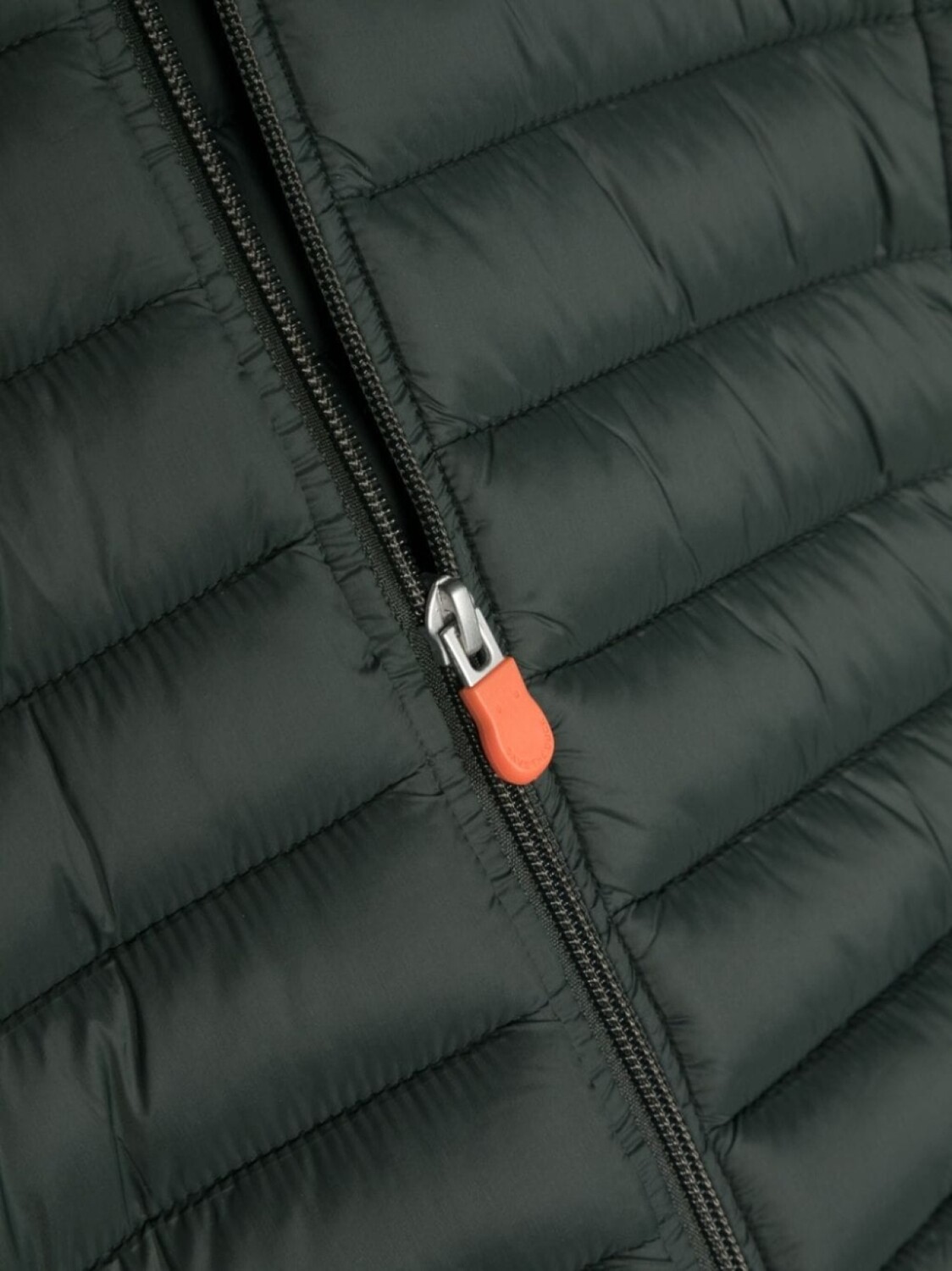 Насыщенный зеленый, дутый материал, стеганая модель, классический капюшон, застежка на молнии спереди, два кармана на молнии по бокам, длинные рукава, эластичные манжеты и прямой подол.