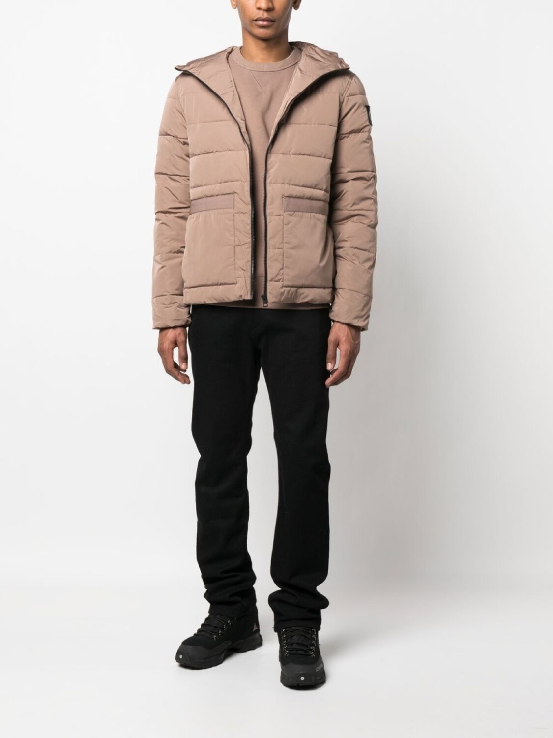 Коричневый, дутый материал, нашивка с логотипом на рукаве, высокий воротник, классический капюшон, застежка на молнии спереди, длинные рукава, эластичные манжеты и два прорезных кармана по бокам.