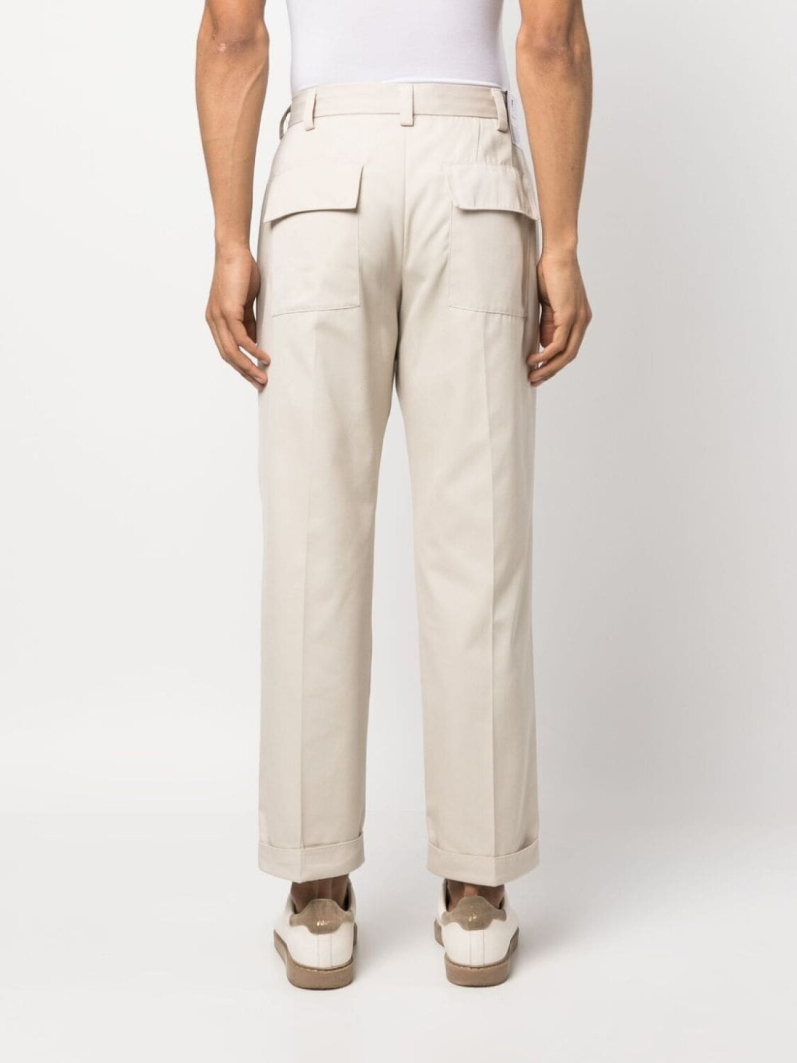 Бежевый, классический крой, петли для ремня, стрелки, смещенная застежка на пуговицах спереди, прямой крой, два вшитых кармана по бокам, два кармана с клапанами сзади, подвороты и высота по щиколотку.
