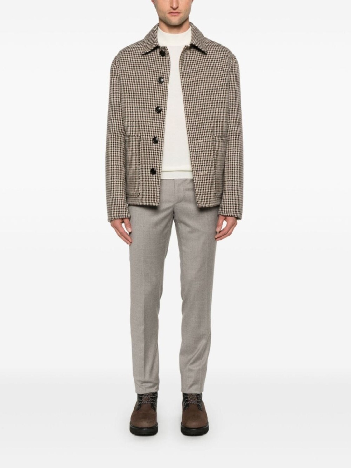 Серый, смесовая вирджинская шерсть, узкий крой, застежка на молнии и пуговице спереди, петли для ремня, стрелки, два вшитых кармана по бокам, два прорезных кармана на пуговицах сзади
