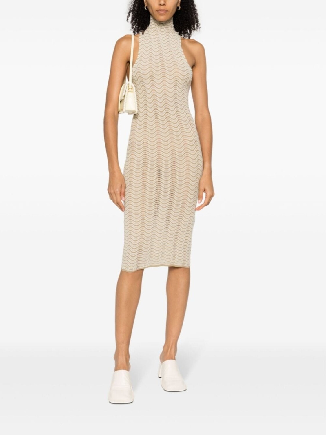 Песочно-бежевый, эластичный материал, кружевное вязание, вязка в технике интарсия, высокий воротник, без рукавов, длина по колено и прямой подол.