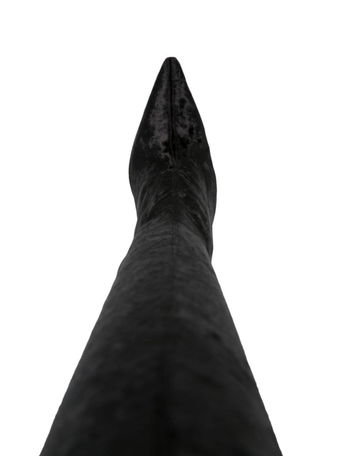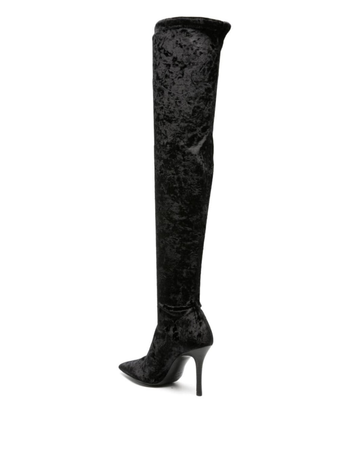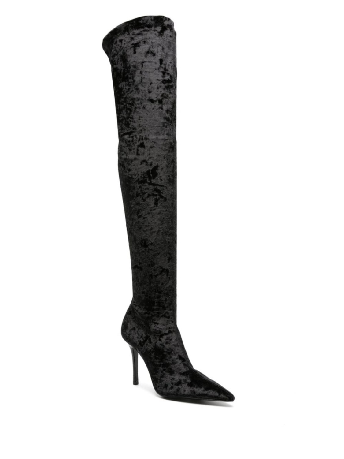 Черный, телячья кожа, жатый бархат, заостренный носок, модель без застежки, высота по колено и каблук на высокой шпильке.