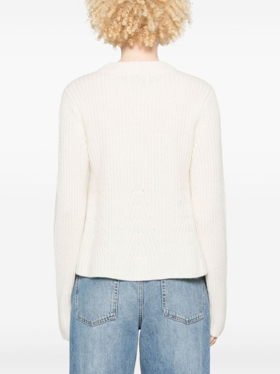 Белый кашемировый трикотаж, конструкция в рубчик, А-силуэт, круглый вырез, длинные рукава, прямой подол