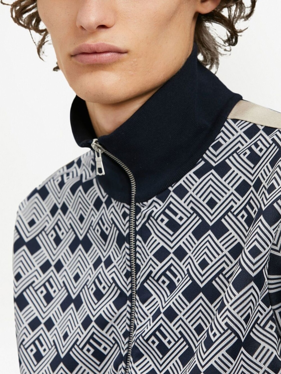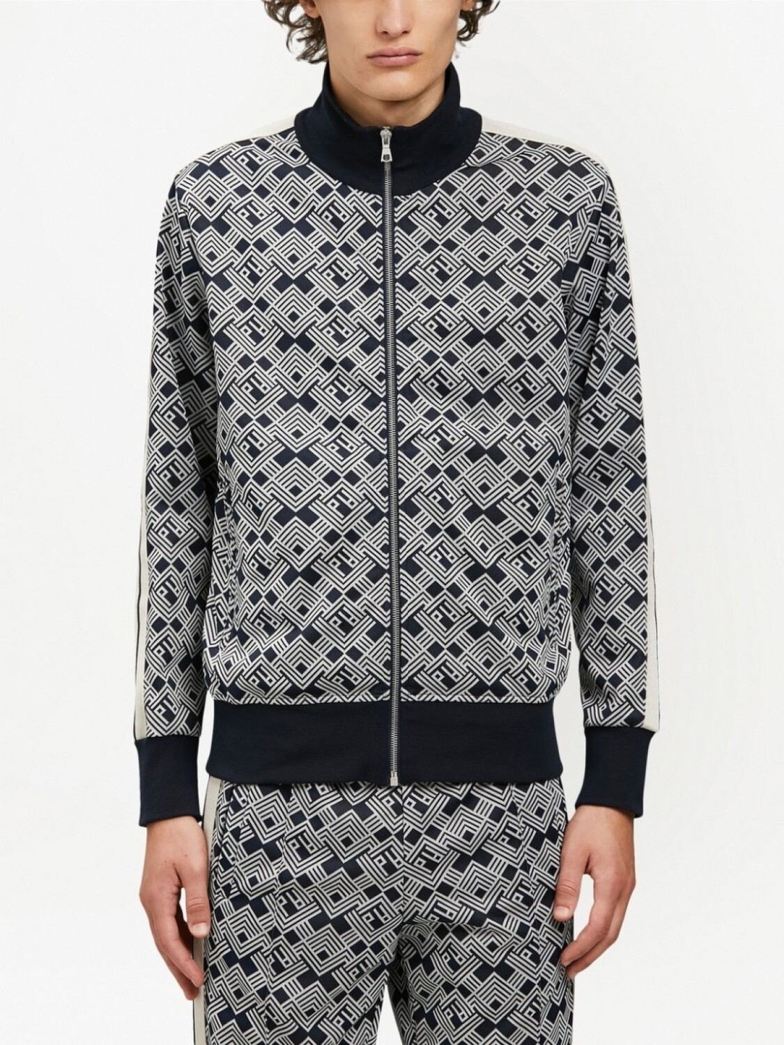 Узор с изображением монограммы, высокий воротник, застежка на молнии спереди, длинные рукава, полоска сбоку, манжеты в рубчик и прямой подол.
