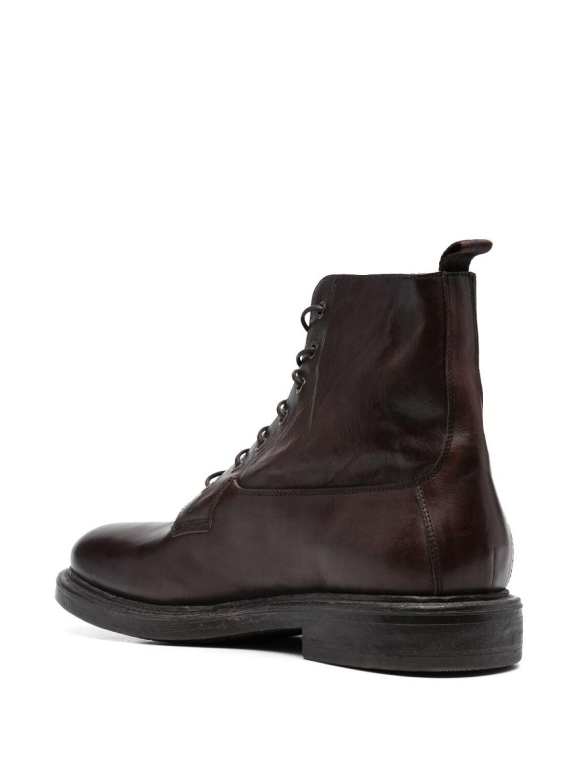 Серо-коричневый, телячья кожа, закругленный носок, шнуровка спереди, петля для подтягивания сзади, высота по щиколотку и плоская резиновая подошва.
