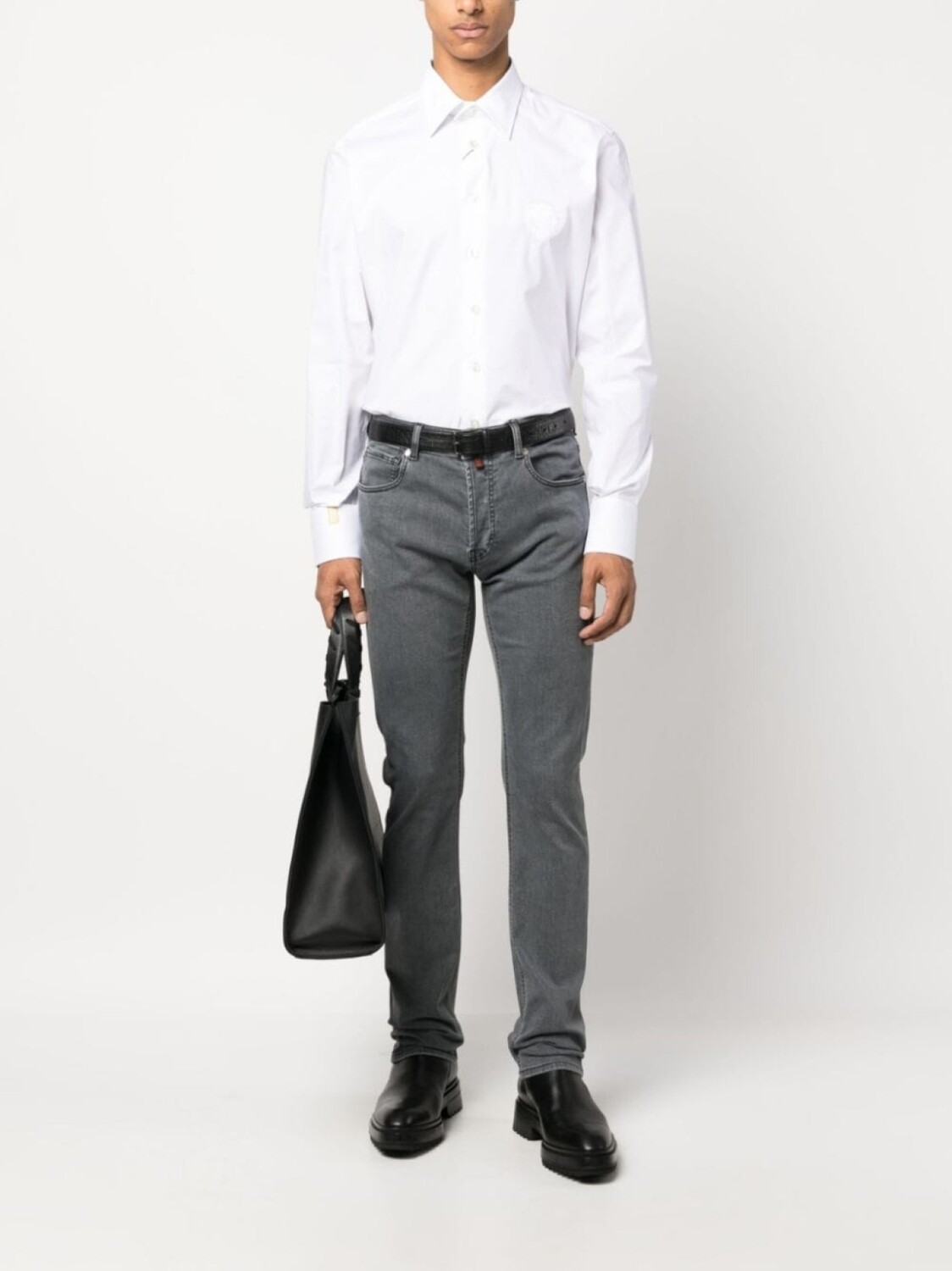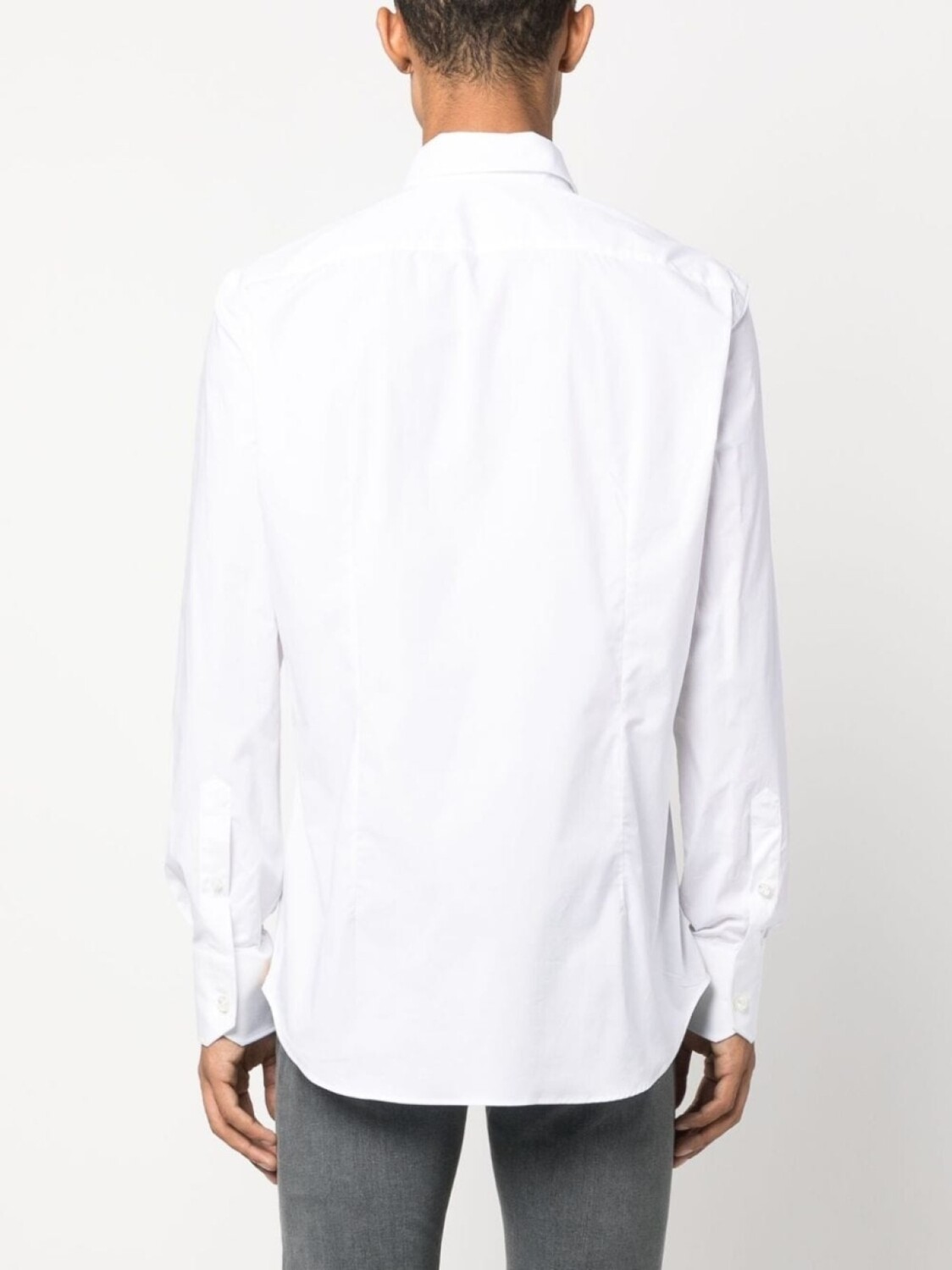 Белый, хлопок, поплин, нашивка с логотипом на рукаве, вышитый логотип на груди, узкий крой, плоский заостренный воротник, застежка на пуговицах спереди, длинные рукава и закругленный подол.