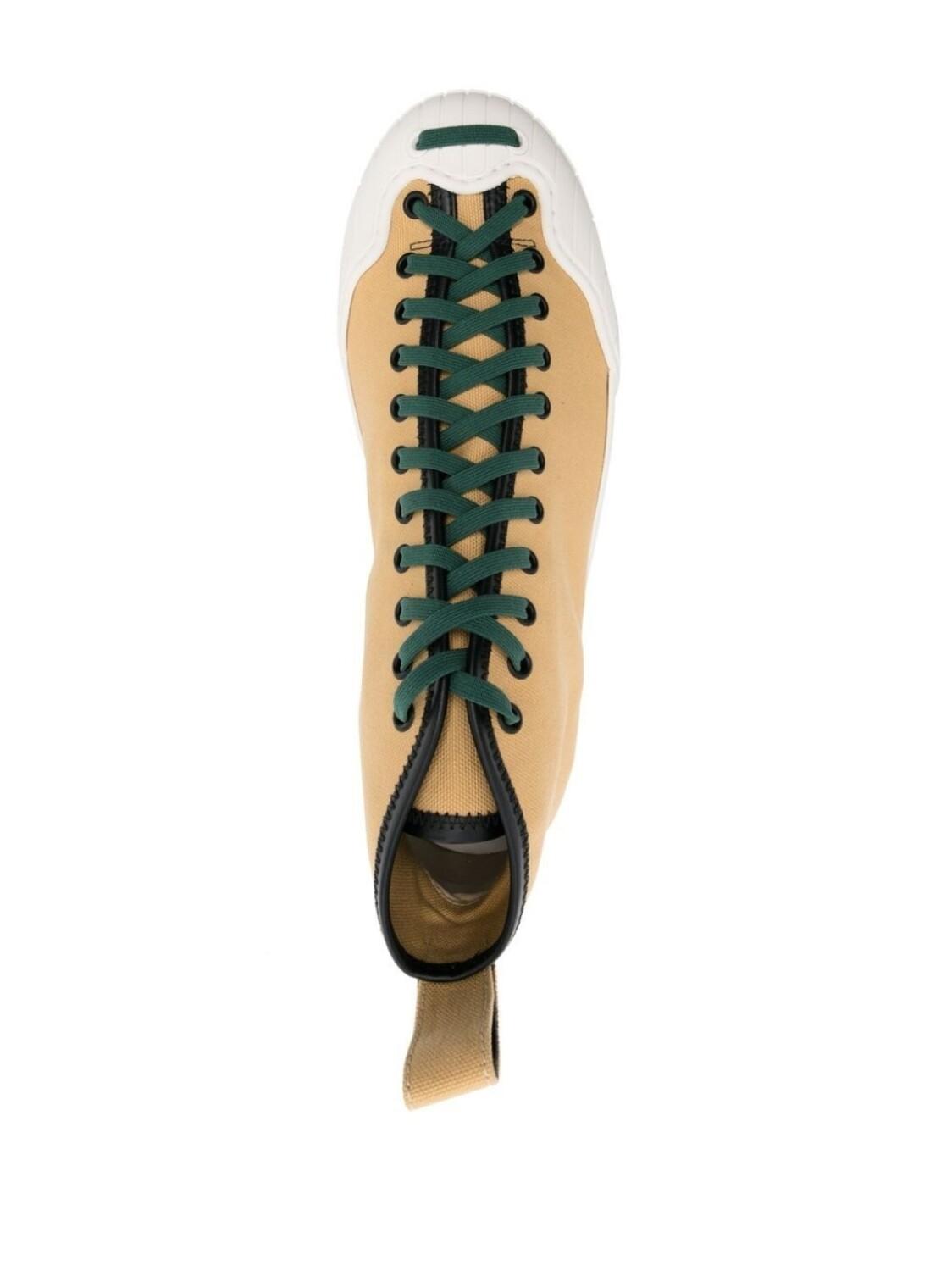 Бежево-желтый, зеленый, белый, логотип на подошве, закругленный носок, высота по щиколотку, шнуровка спереди, петля для подтягивания сзади и плоская резиновая подошва.