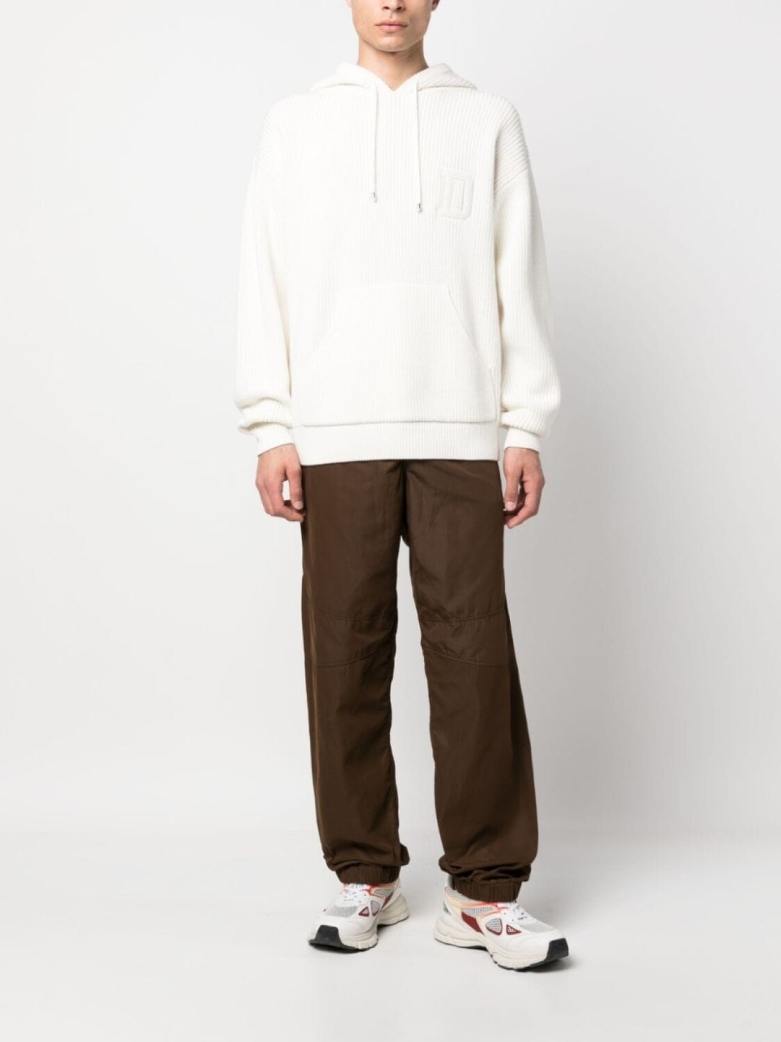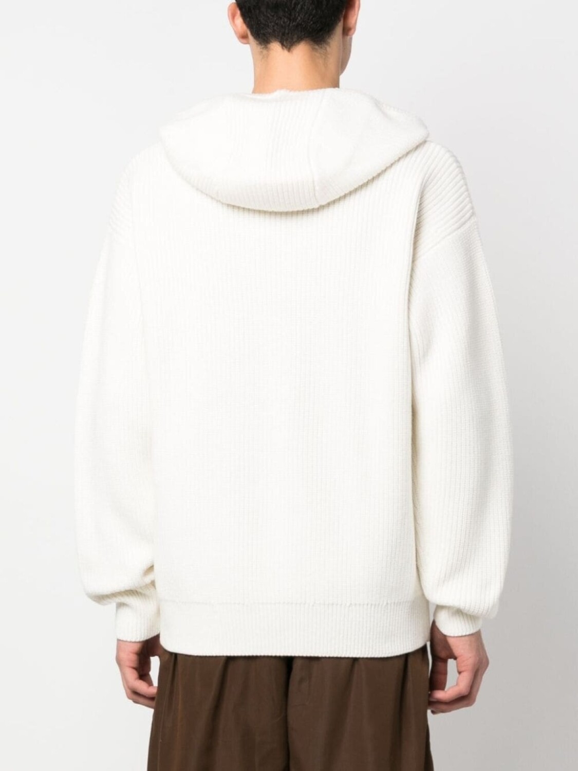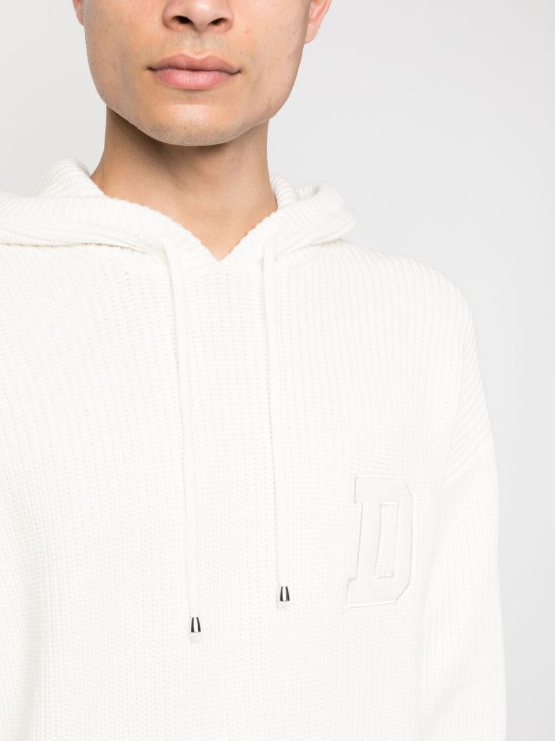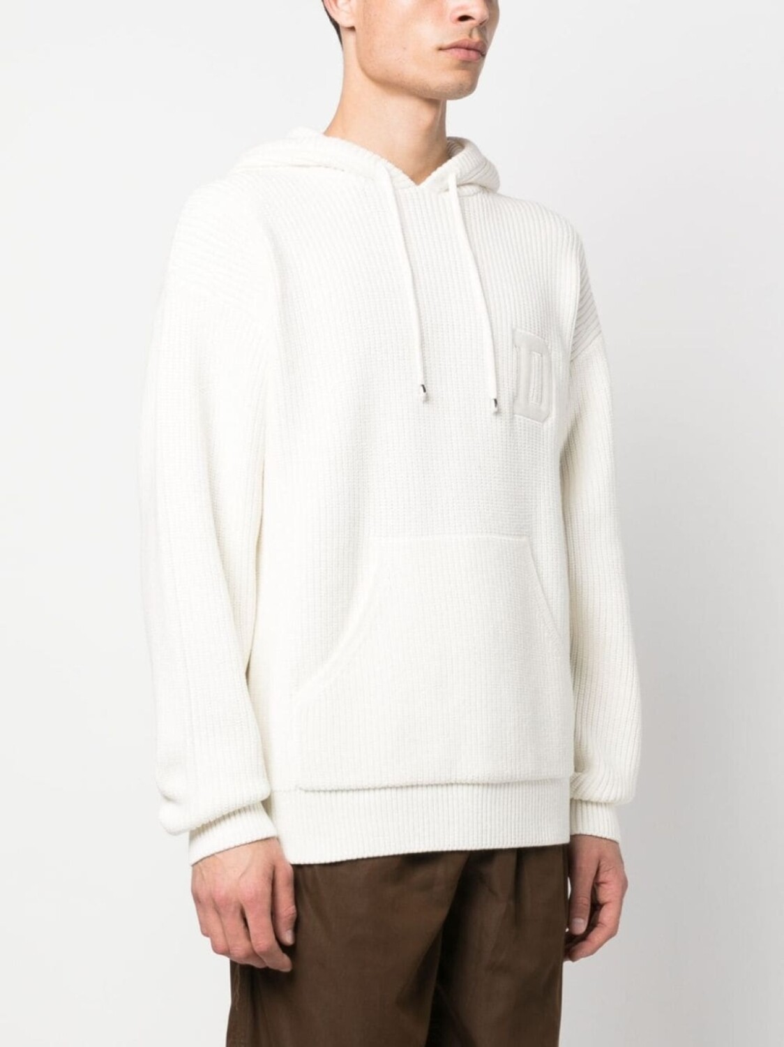 Кремово-белый, смесь хлопка и шерсти, вафельная вязка, вышитый логотип на груди, затягивающийся на шнурок капюшон, карман-муфта, приспущенные плечи и длинные рукава.
