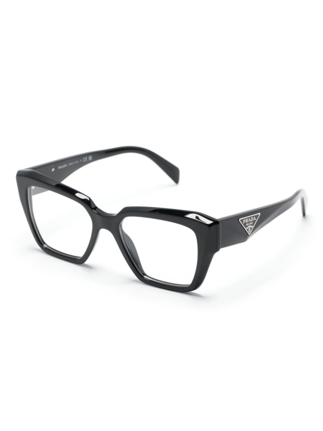 Черный, оправа геометрической формы, металлический логотип на дужке, прозрачные линзы, прямые дужки и дужки с закругленными концами. Обратите внимание, что на FARFETCH продаются оправы с линзами без диоптрий.