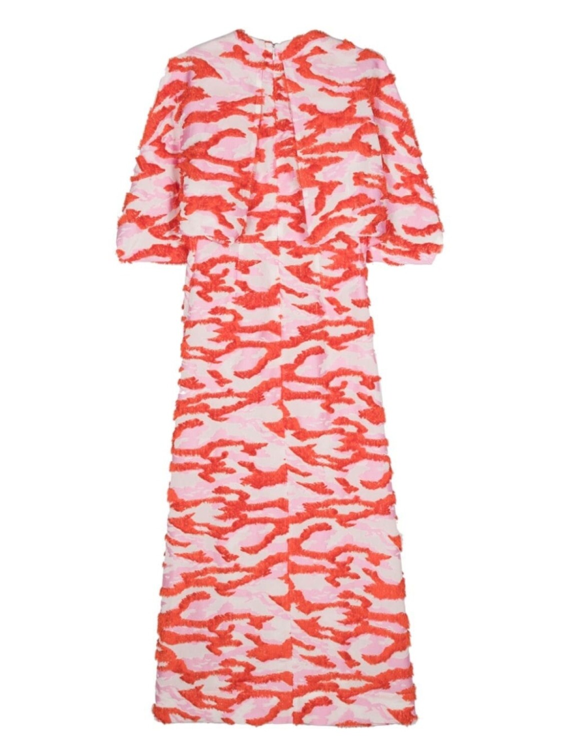Оранжевая/розовая/белая бахрома, абстрактный узор, принт, круглый вырез, короткие рукава-фонарики, драпировка, вырезы, длинная модель, без подкладки, потайная застежка-молния сзади