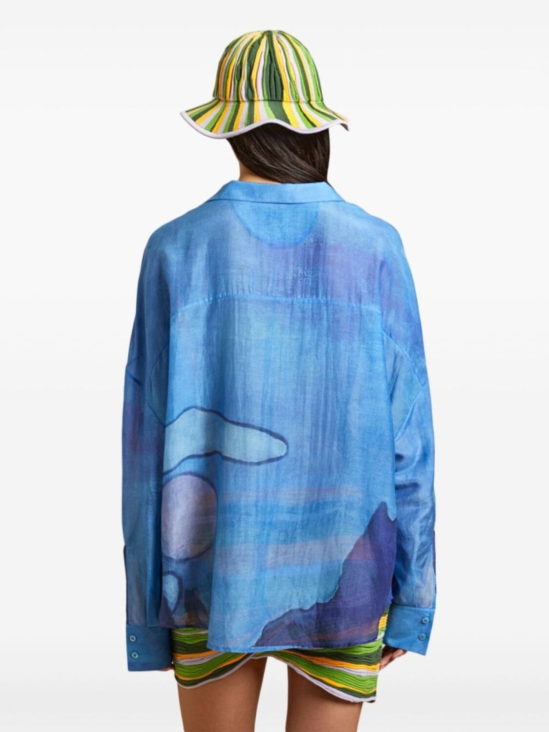 Синий, смесь хлопка и шелка, абстрактный принт, застежка на пуговицы, кубинский воротник, длинные рукава, манжеты на пуговицах, прямой подол, Это унисекс-модель. Обратите внимание, что для нее используется мужская размерная сетка.