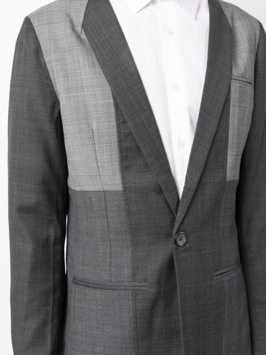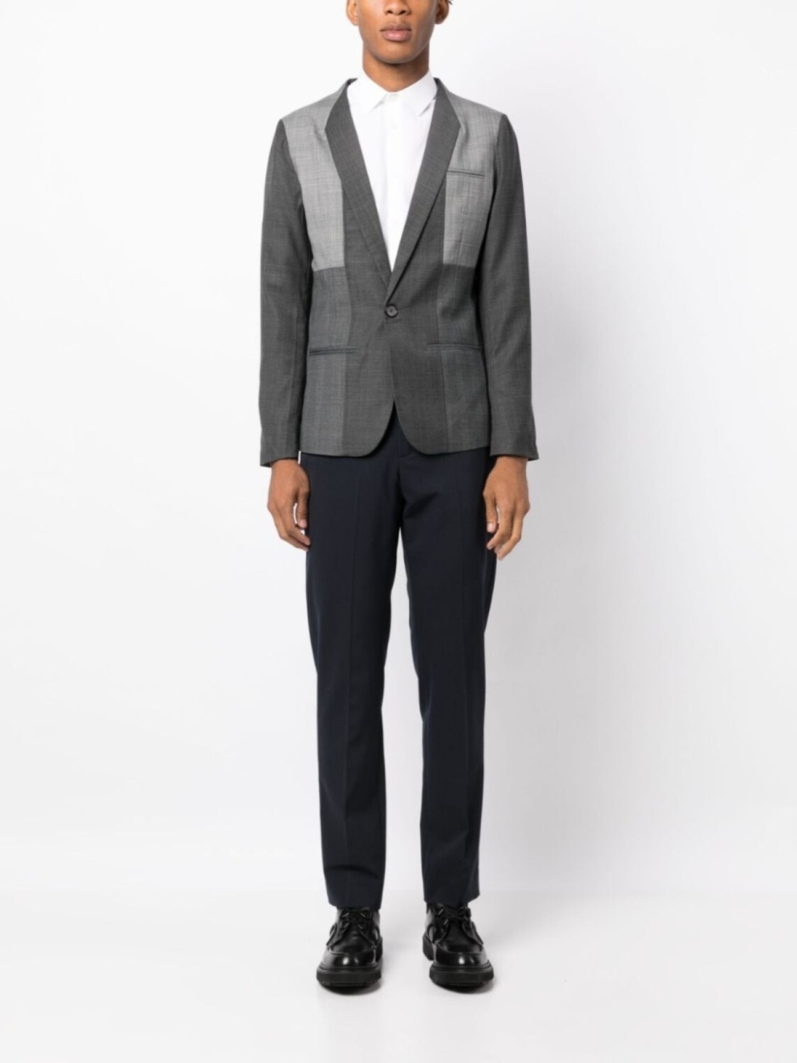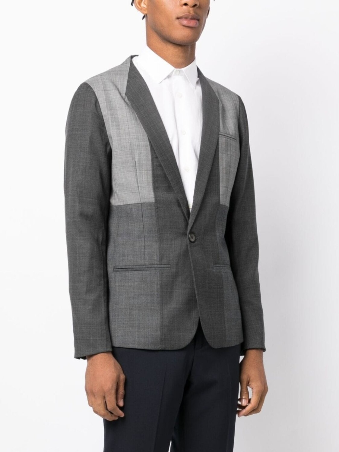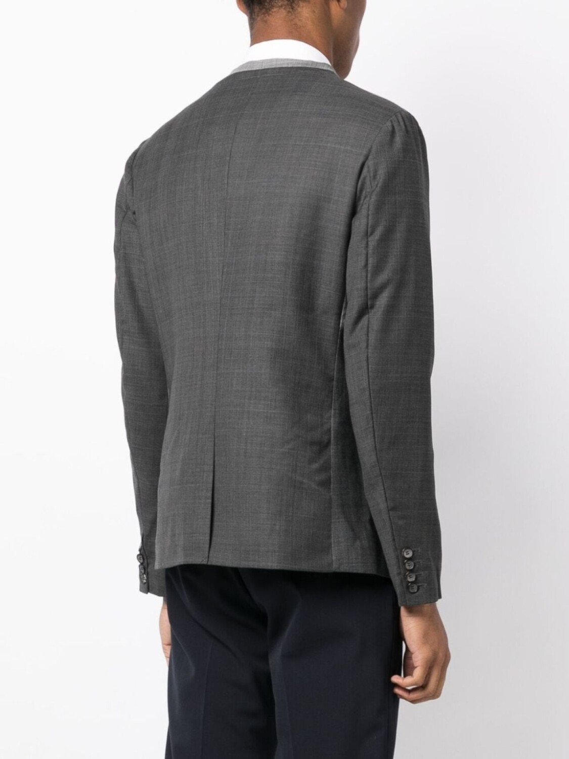 Серый, смесовая шерсть, лацканы-шалька, шлица по центру сзади, застежка на пуговицах спереди, нагрудный прорезной карман, два прорезных кармана спереди, длинные рукава, рукава с манжетами на пуговицах и закругленный подол.
