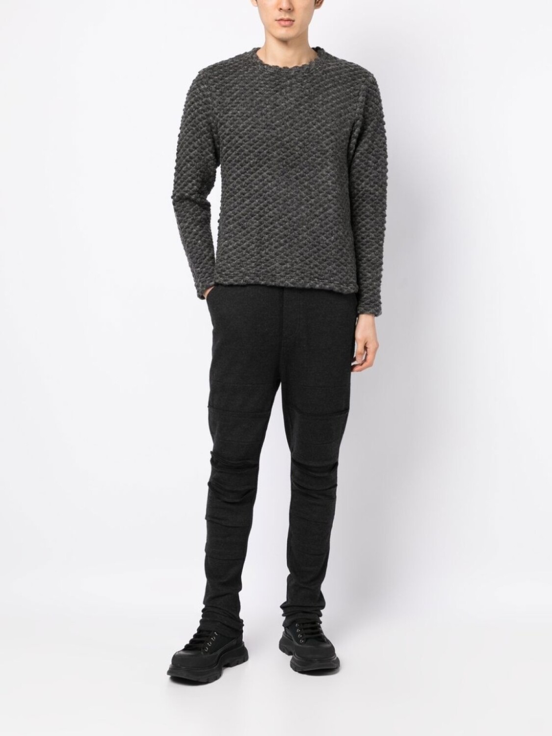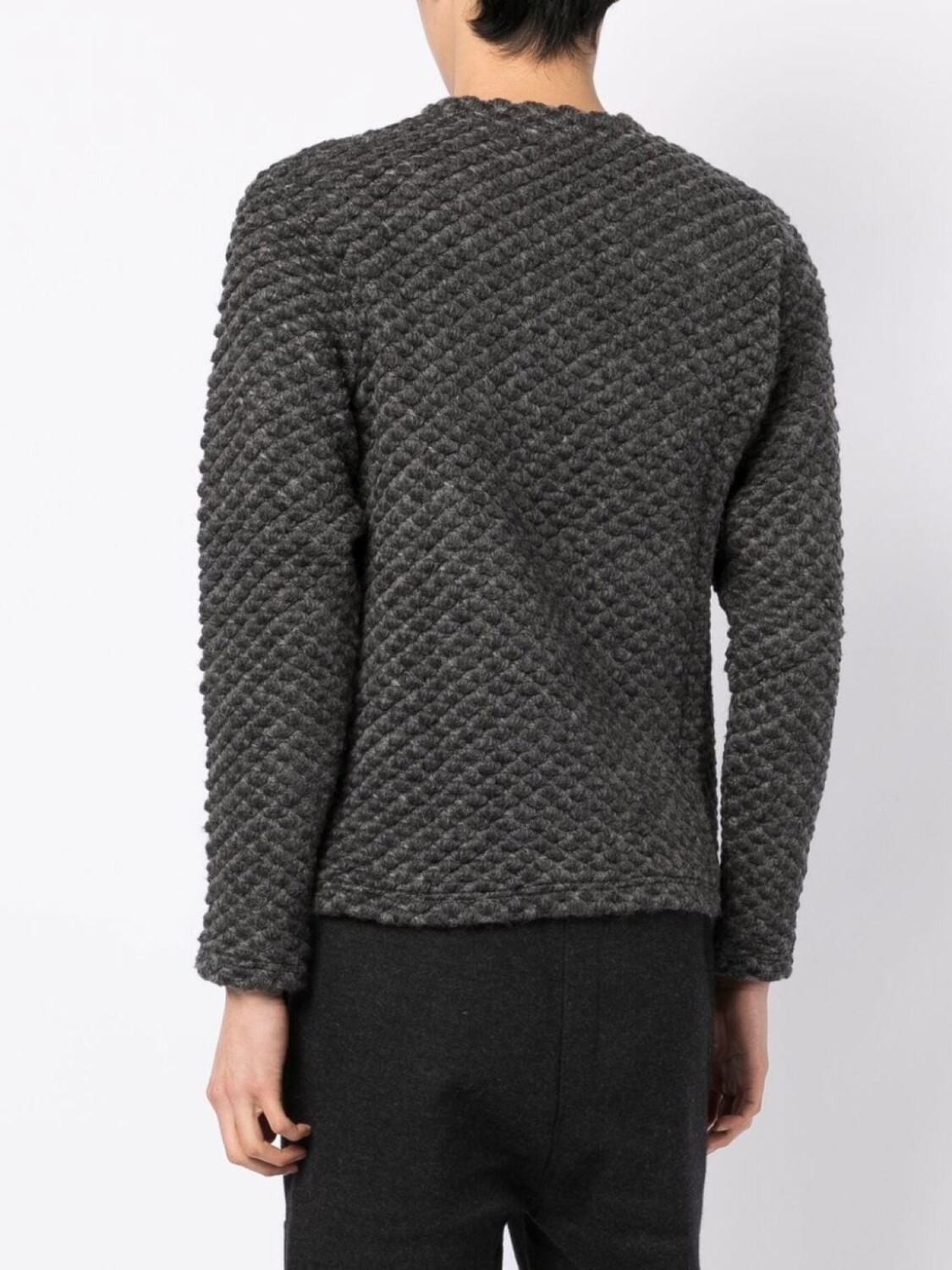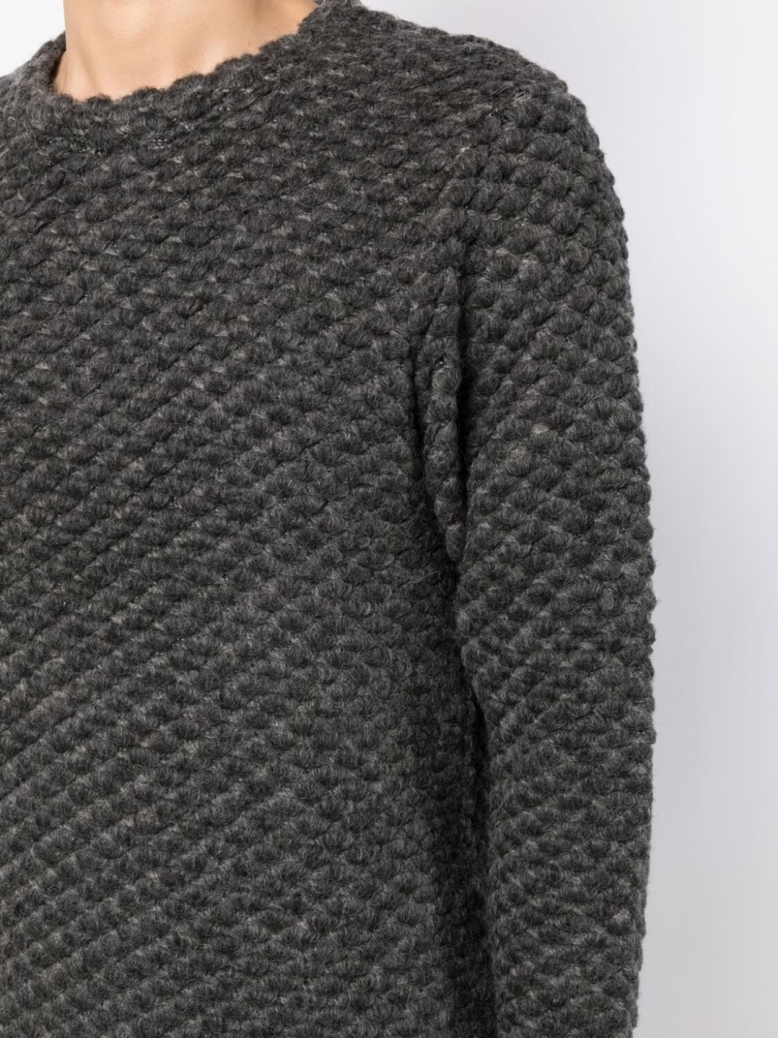 Серый, смесь шерсти и кашемира, трикотажный материал, круглый вырез, длинные рукава и прямой подол.