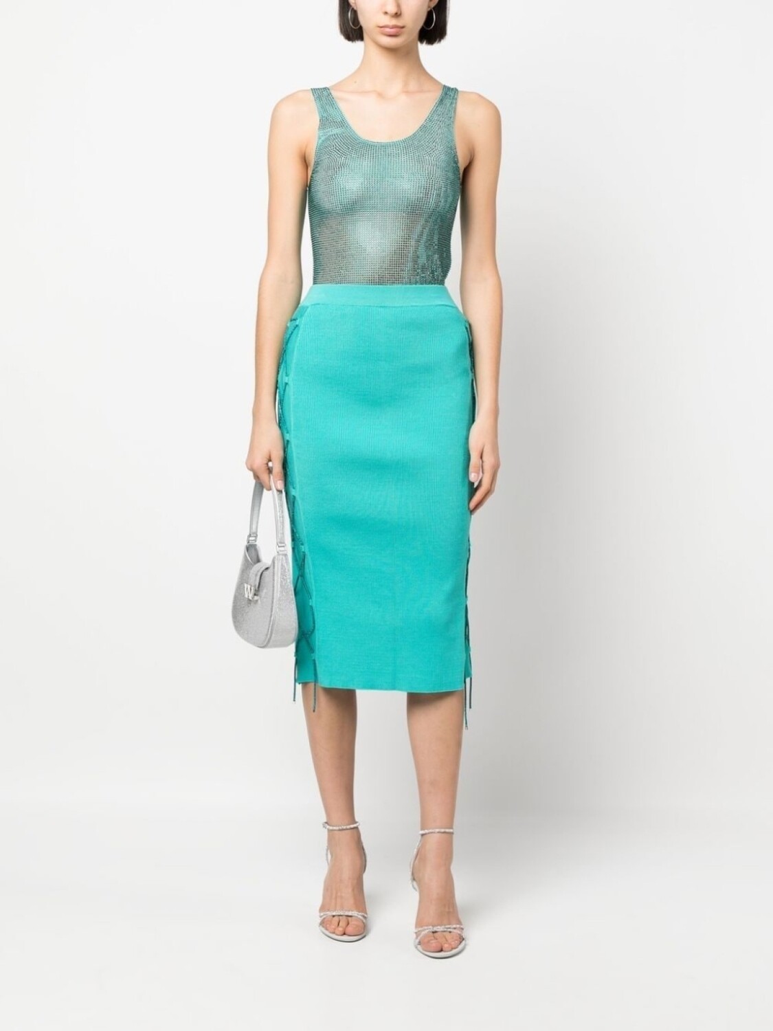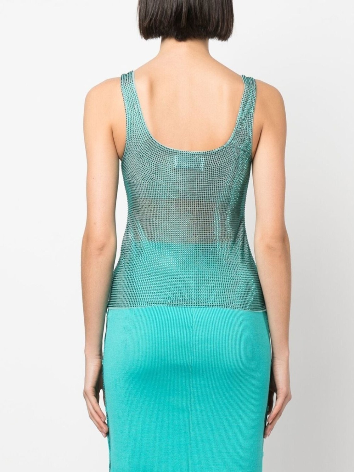 Сине-зеленый, эластичный материал, украшения из горного хрусталя, U-образный вырез, без рукавов и прямой подол.