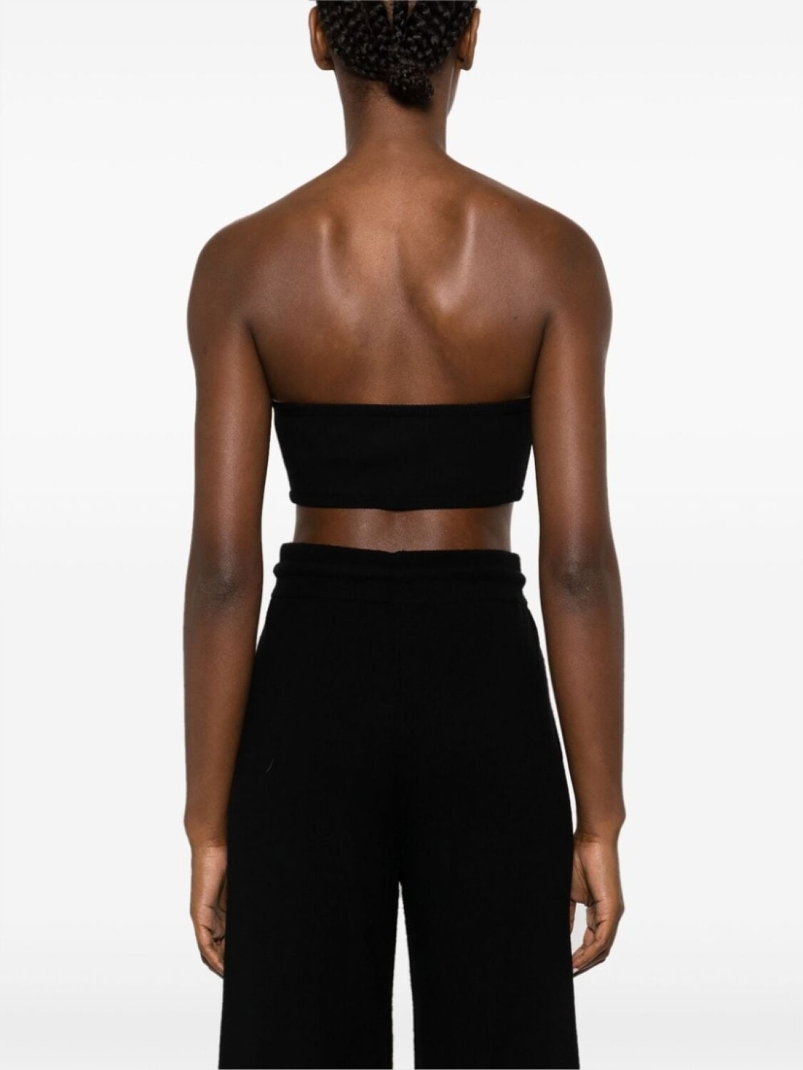 Черный, трикотаж в рубчик, вязаные края в рубчик, заклепки, цветочная вышивка спереди, без рукавов, прямой подол и укороченная длина.