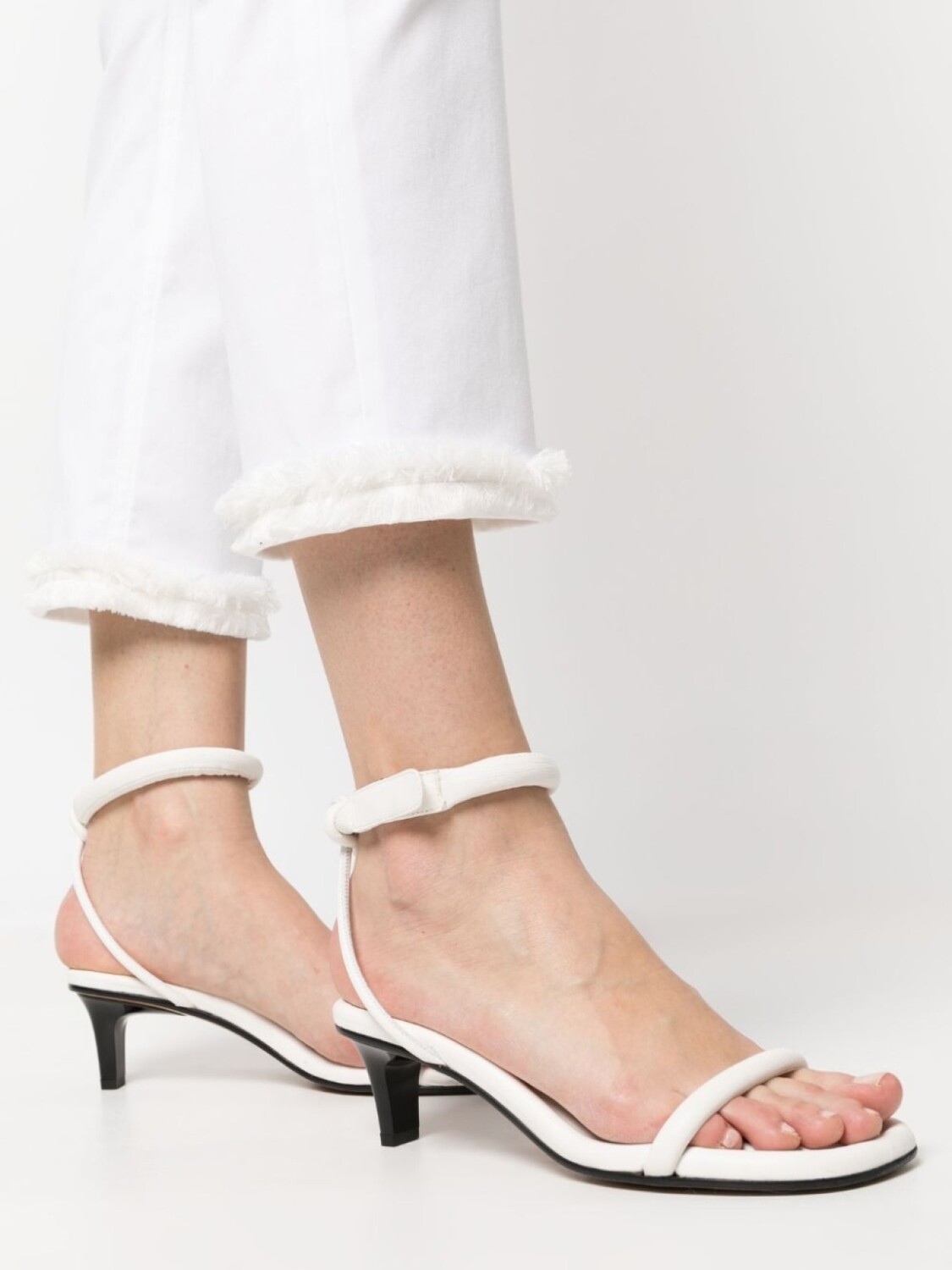 Кремовый, эластичный хлопок, застежка на молнии и пуговице спереди, два накладных кармана сзади, петли для ремня, необработанные края и узкий крой.