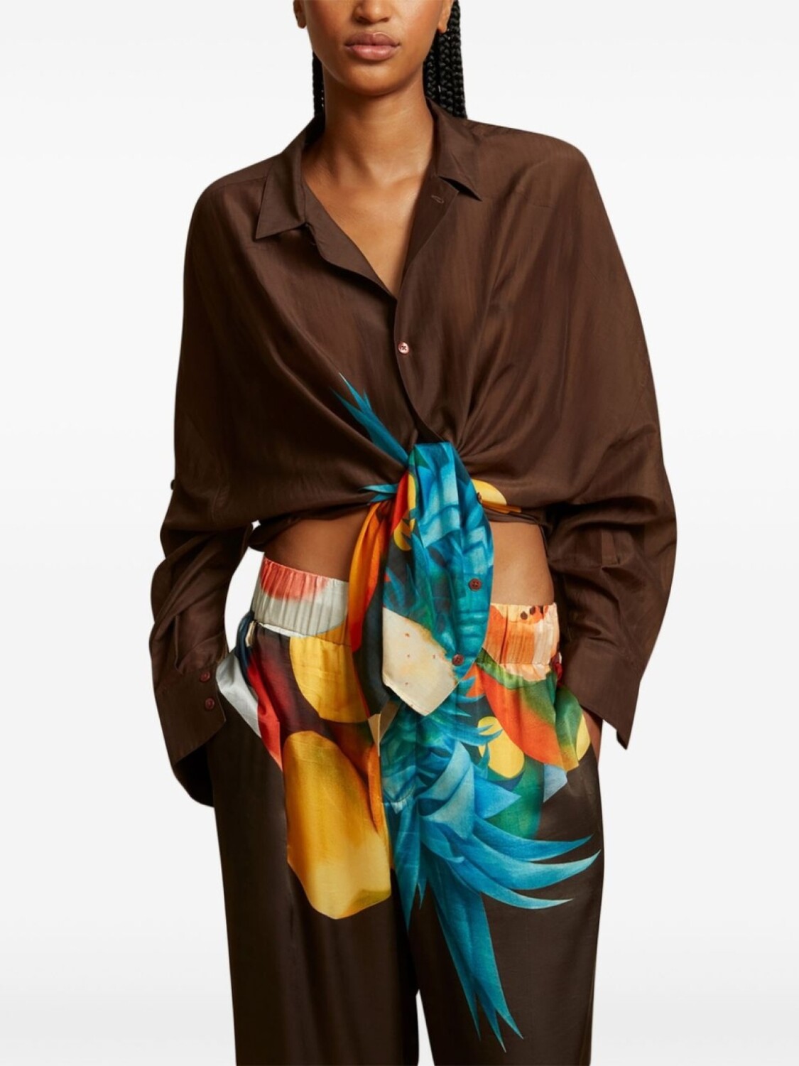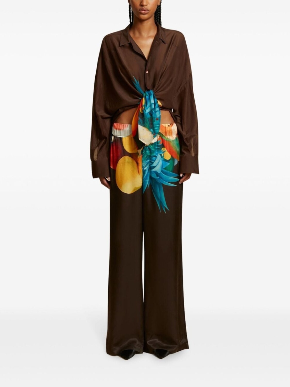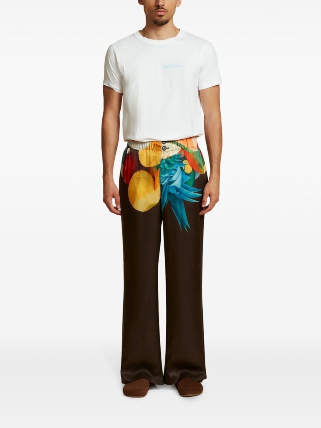 Шоколадно-коричневый/многоцветный шелковый графический принт спереди, застежка на пуговицы спереди, эластичный пояс, два прорезных кармана по бокам, широкие штанины. При покупке этой вещи унисекс имейте в виду, что она имеет стандартные мужские размеры.