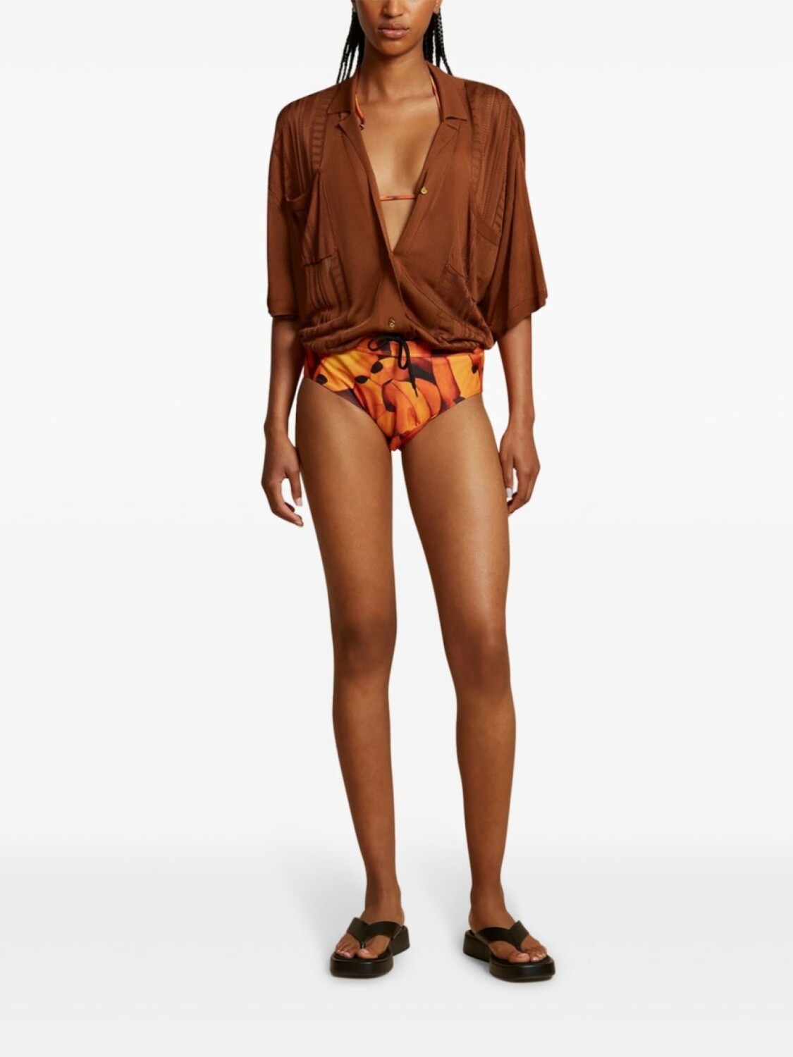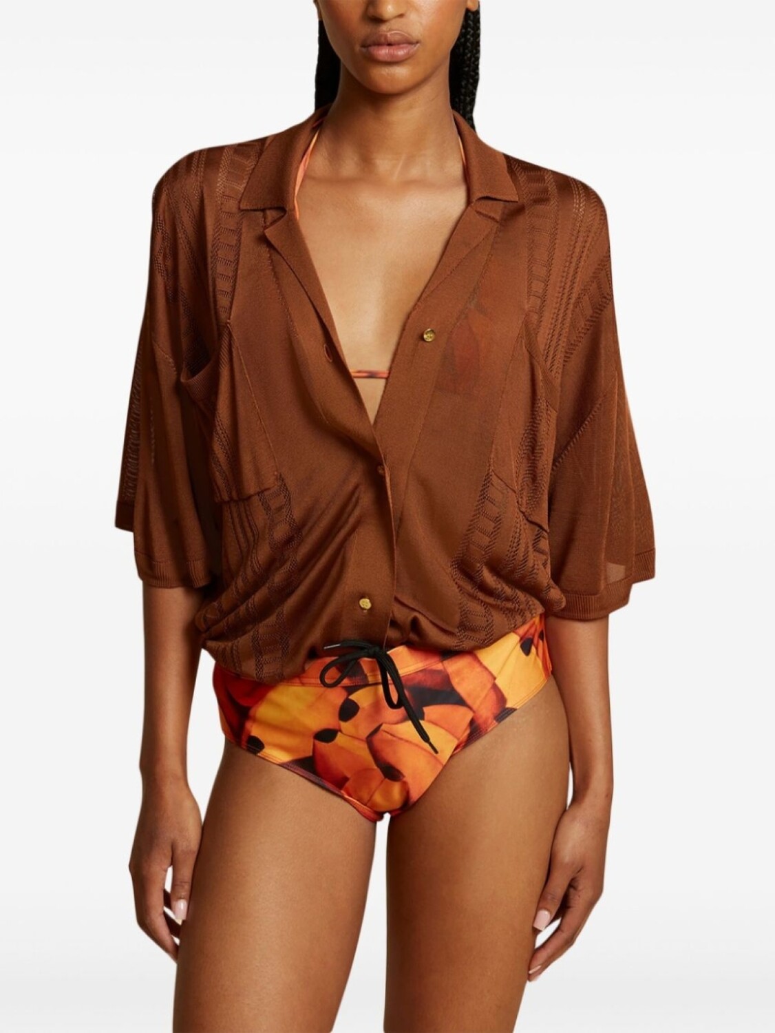 Коричневый легкий трикотаж в рубчик, застежка на пуговицы, золотистые пуговицы, косой воротник, короткие рукава, два накладных кармана на груди, ребристый подол. При покупке этого изделия унисекс имейте в виду, что оно соответствует стандартным мужским размерам.