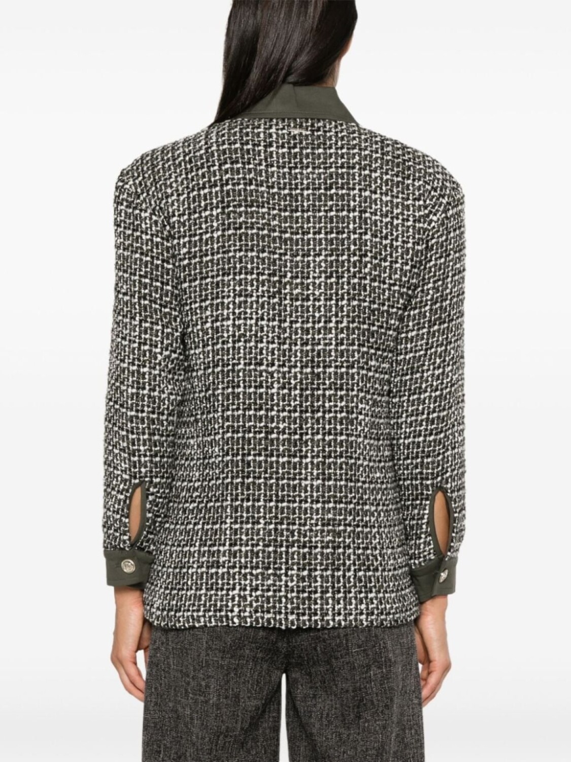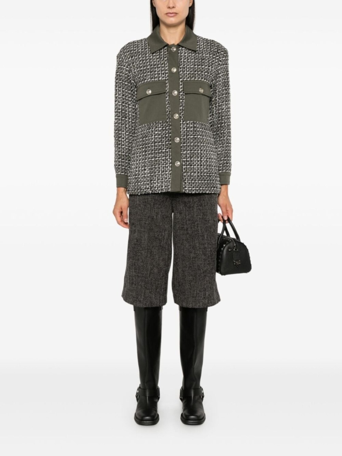 Оливково-зеленый/белый, ткань букле, застежка на пуговицах спереди, отложной воротник, длинные рукава, манжеты на пуговицах, два кармана на пуговицах спереди, цельная подкладка, прямой подол