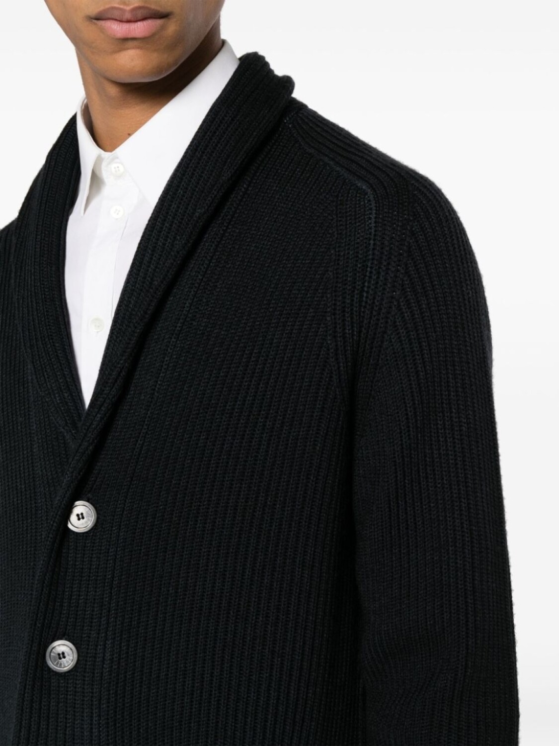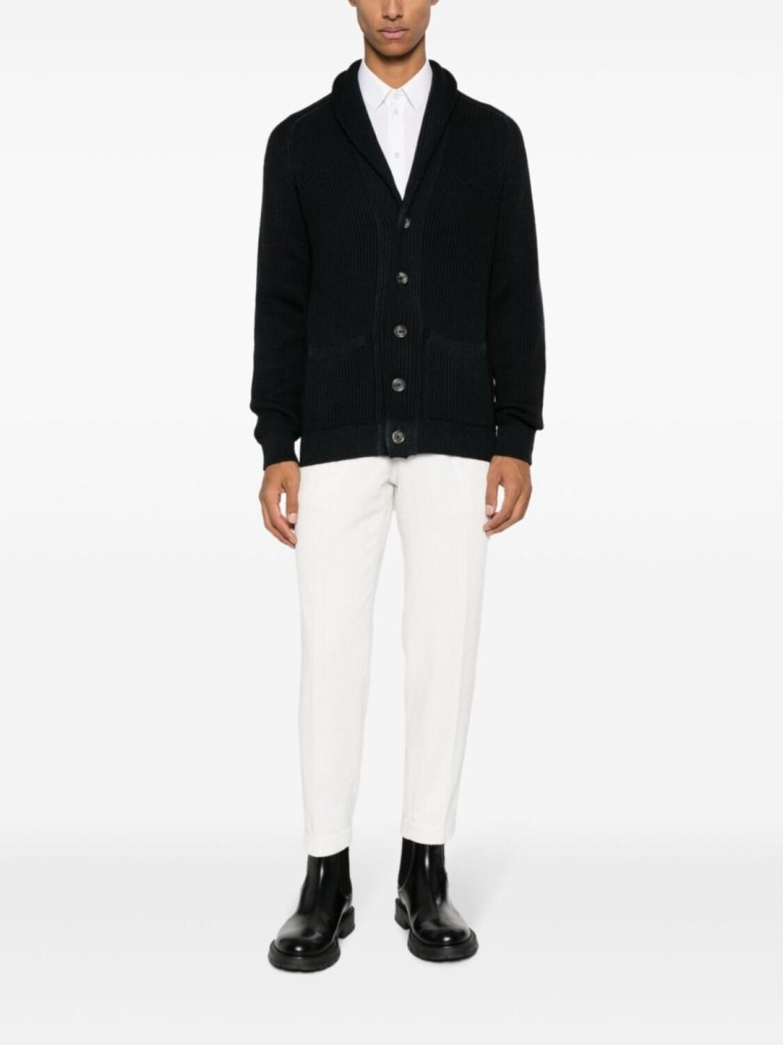 Черный, шерсть мериноса, трикотаж в рубчик, шалевый воротник, V-образный вырез, застежка на пуговицах спереди, длинные рукава реглан и два накладных кармана спереди.