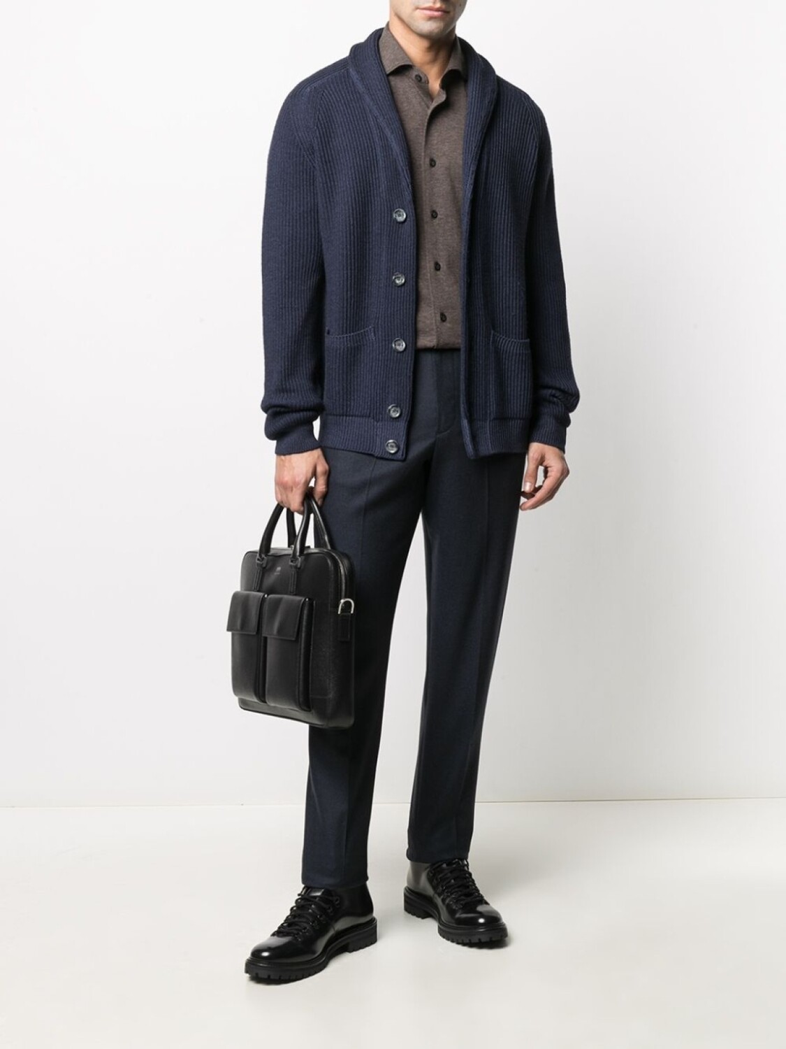 Косой воротник, застежка на пуговицах спереди, длинные рукава, манжеты на пуговицах и закругленный подол.