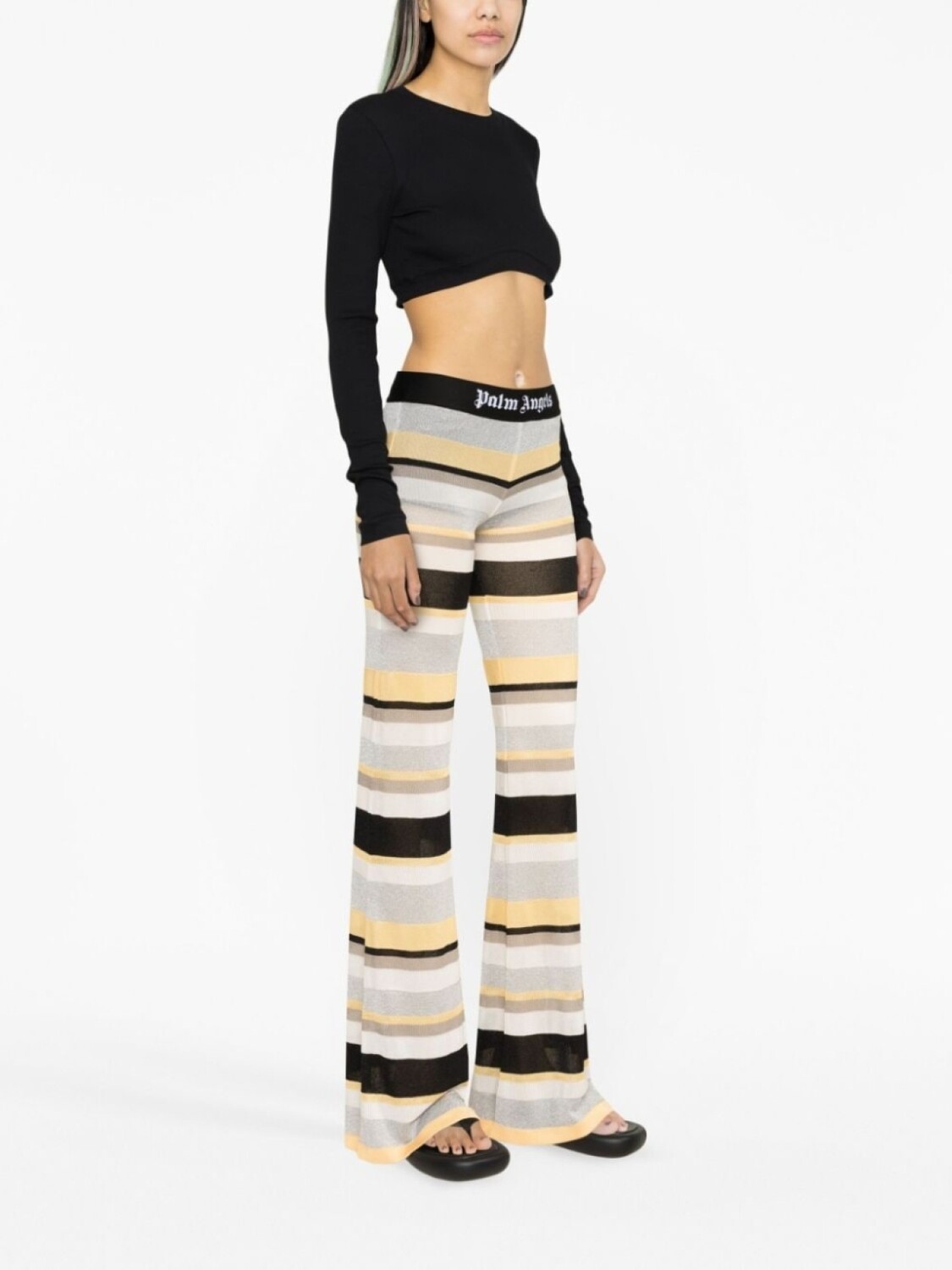 Серый/белый, желтый, черный, трикотажный материал, вставки из люрекса, узор в горизонтальную полоску, пояс с логотипом и расклешенный крой.