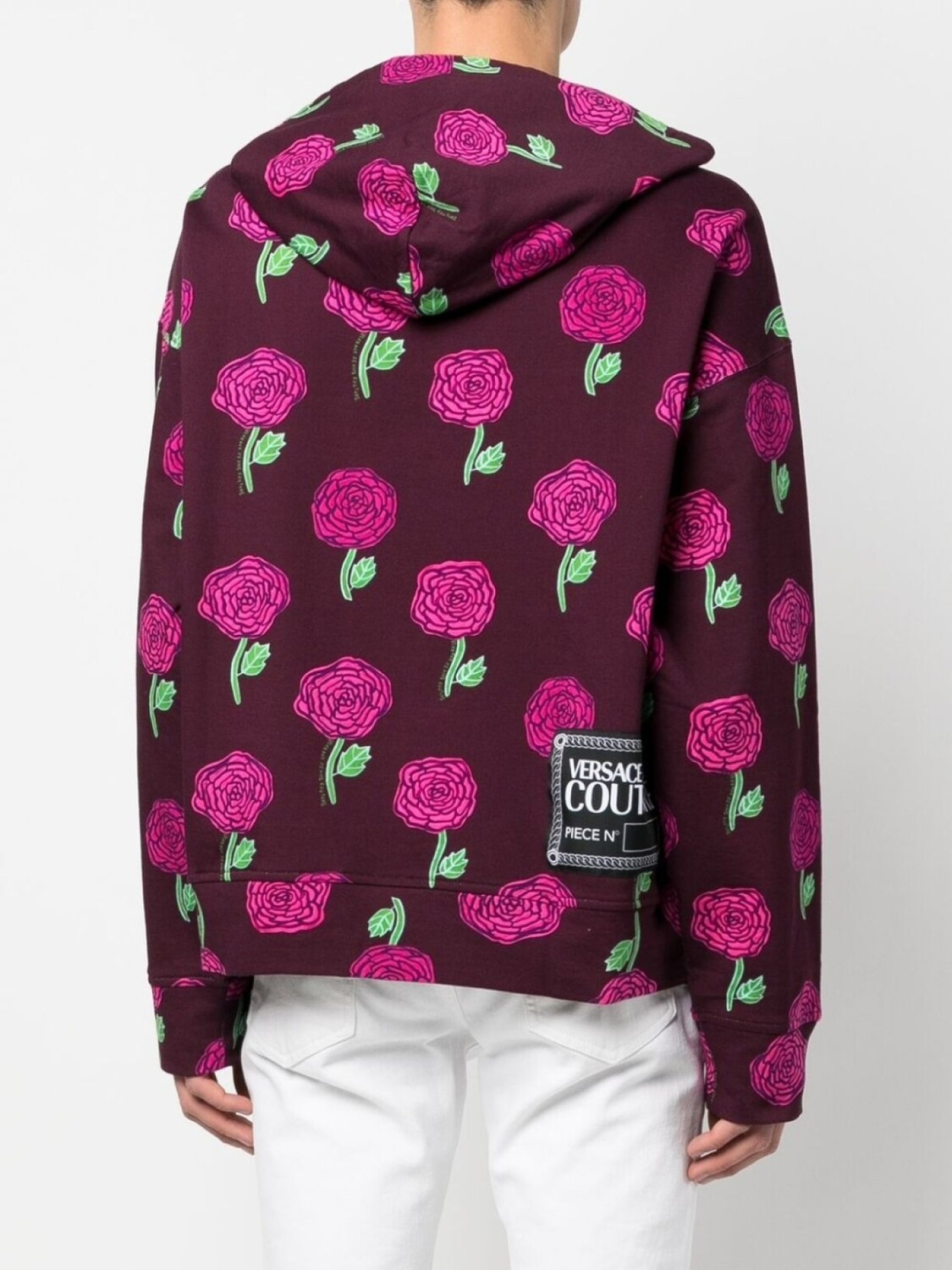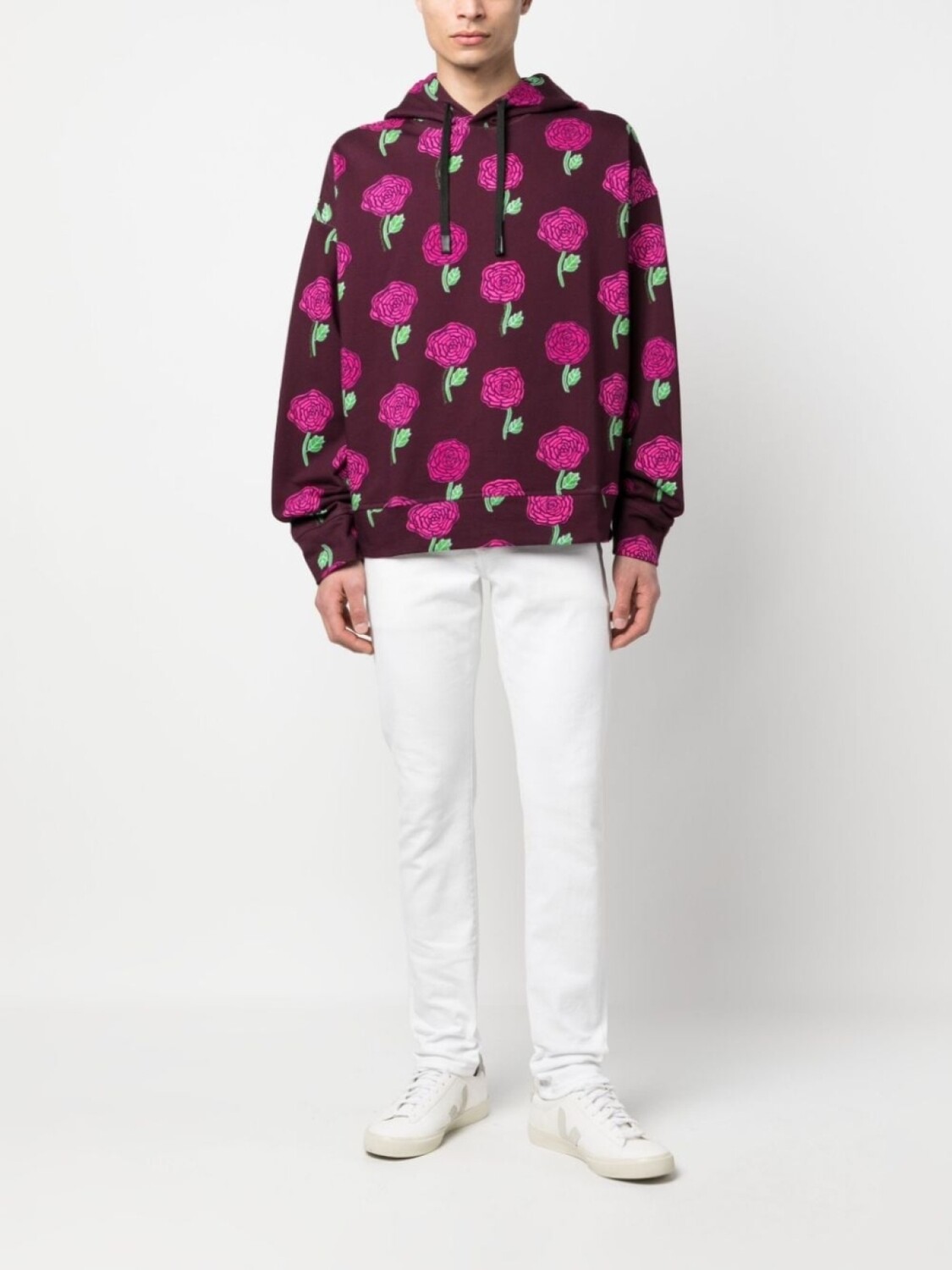 Бордовый, розовый, хлопок, затягивающийся на шнурок капюшон, нашивка с логотипом сбоку, сплошной принт с изображением роз и длинные рукава.