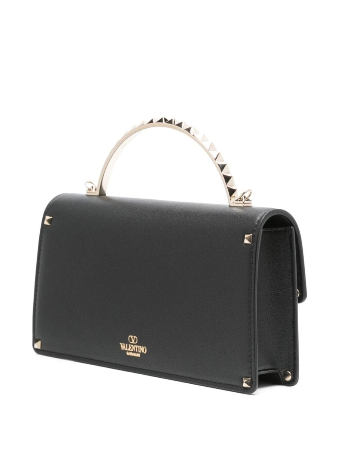 Черный, телячья кожа, гладкая текстура кожи, откидной верх, застежка на зажиме, круглая верхняя ручка, съемный цепочный ремень на плечо, заклепки Rockstud, тисненый логотип сзади, основное отделение, внутренние отделения для карт, тисненый логотип внутри, В комплект входит мешок-пыльник для хранения.