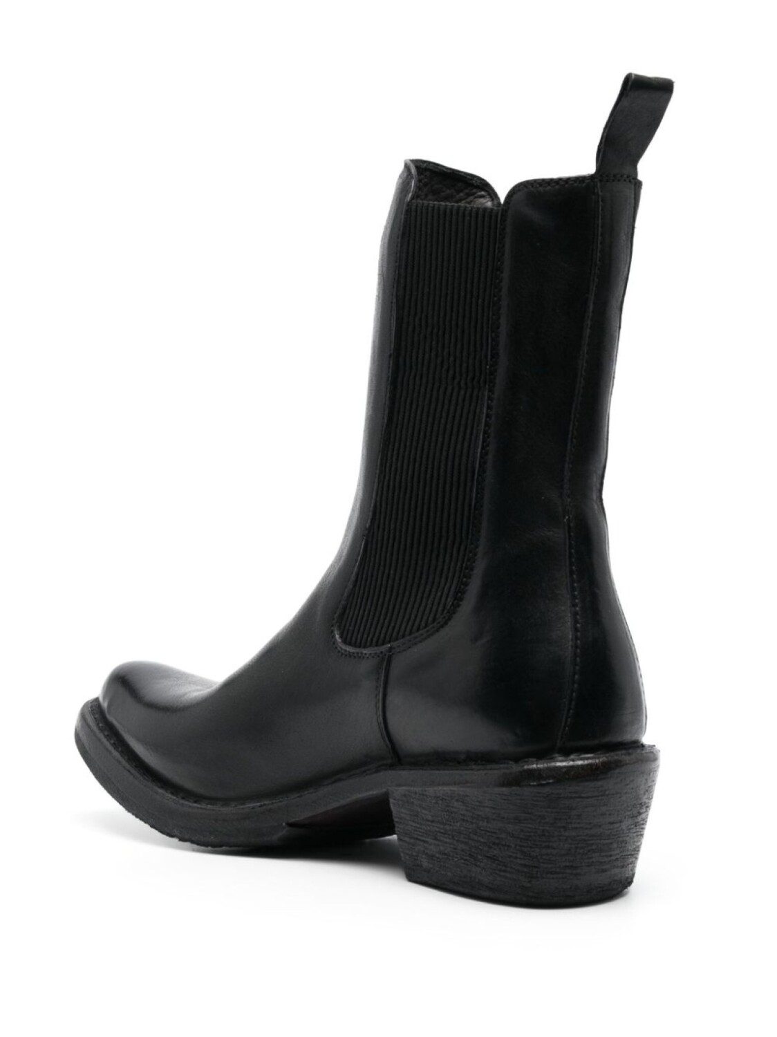 Черный, телячья кожа, заостренный носок, эластичные боковые вставки, высота по щиколотку и низкий каблук.