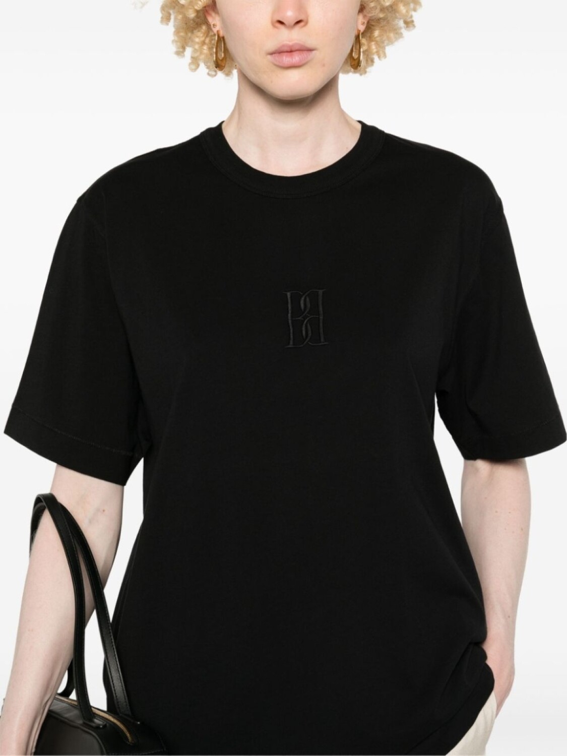 Черный, органический хлопок, ткань джерси, круглый вырез, вышитая монограмма спереди, короткие рукава, прямой подол, Этот товар как минимум на 50% состоит из органических материалов., Узнать больше о том, какие товары получают отметку «Ответственный выбор», можно здесь.