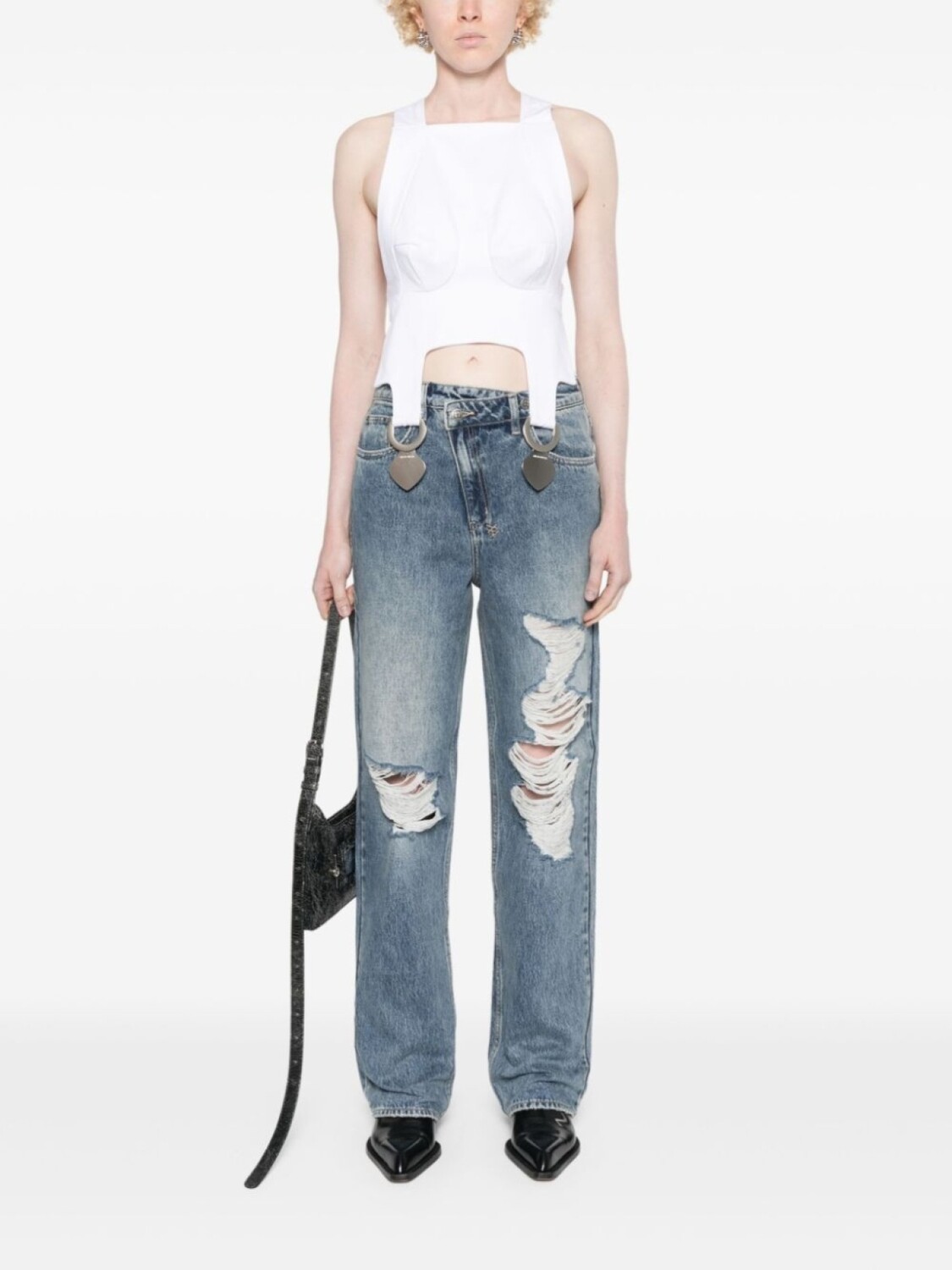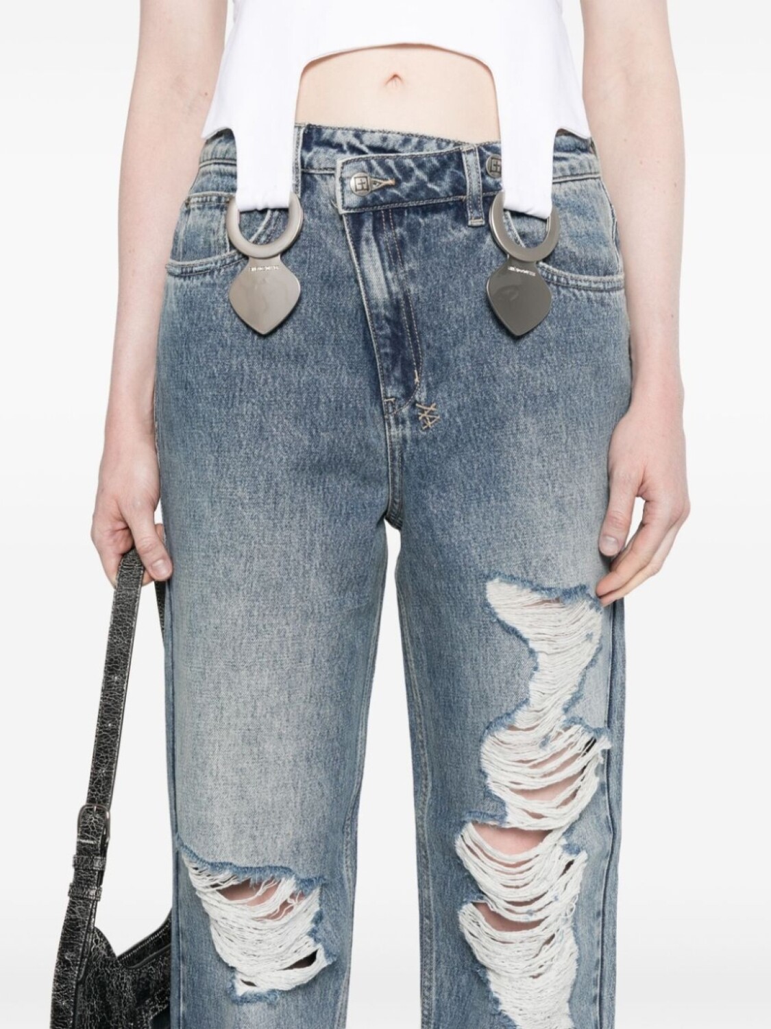 Индигово-голубой хлопковый деним контрастная строчка рваные детали выгравированный логотип серебристая фурнитура вышитый логотип сзади шлевки для ремня пять классических карманов смещенный от центра перед застежкой на две пуговицы застежка на молнию высокая талия прямые штанины без подкладки