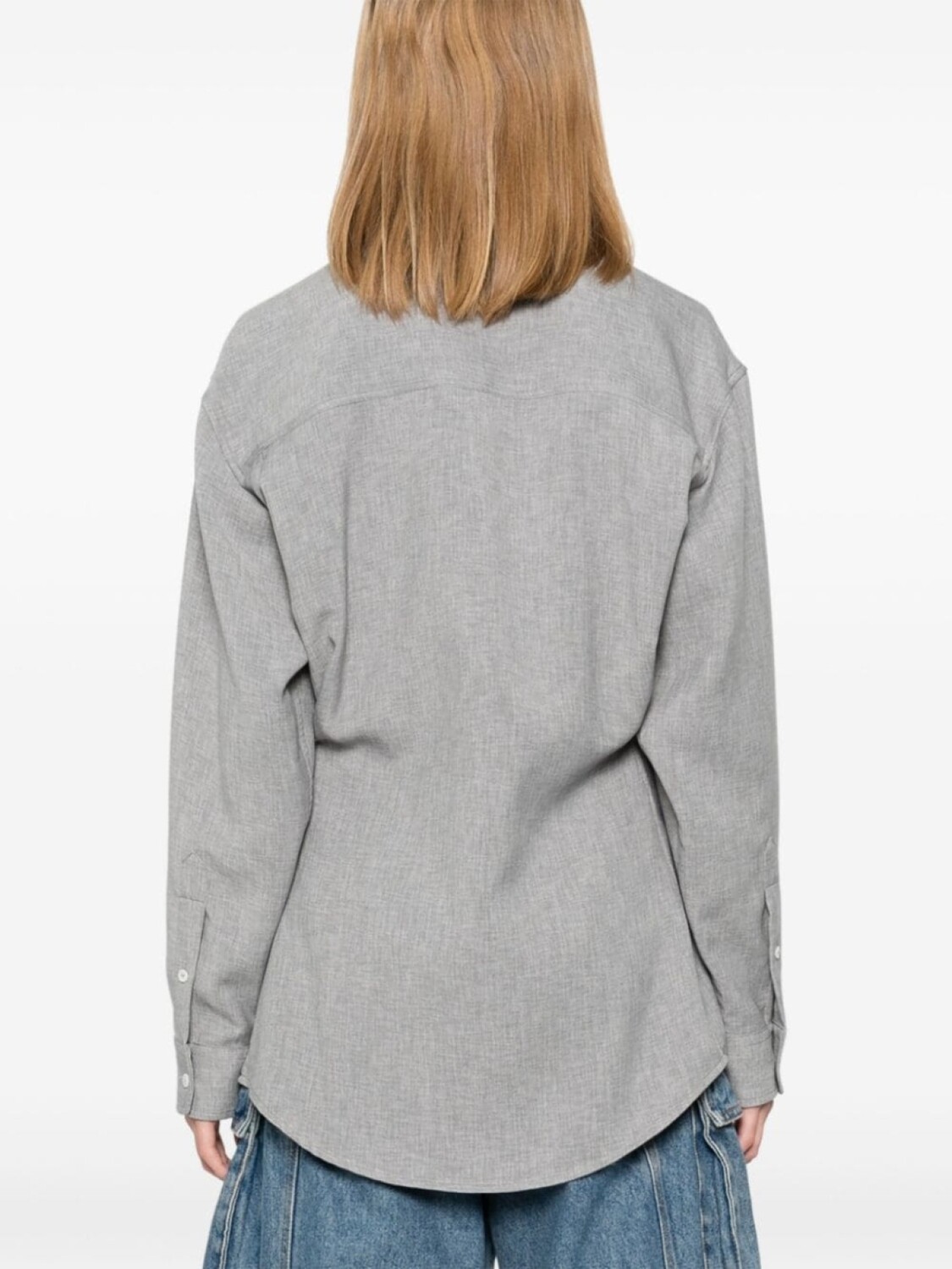 Серый интерлок с эффектом меланжа застежка на пуговицы спереди отложной воротник спущенное плечо длинные рукава манжеты на пуговицах нагрудный накладной карман вышитый логотип на груди складки декоративный изогнутый подол