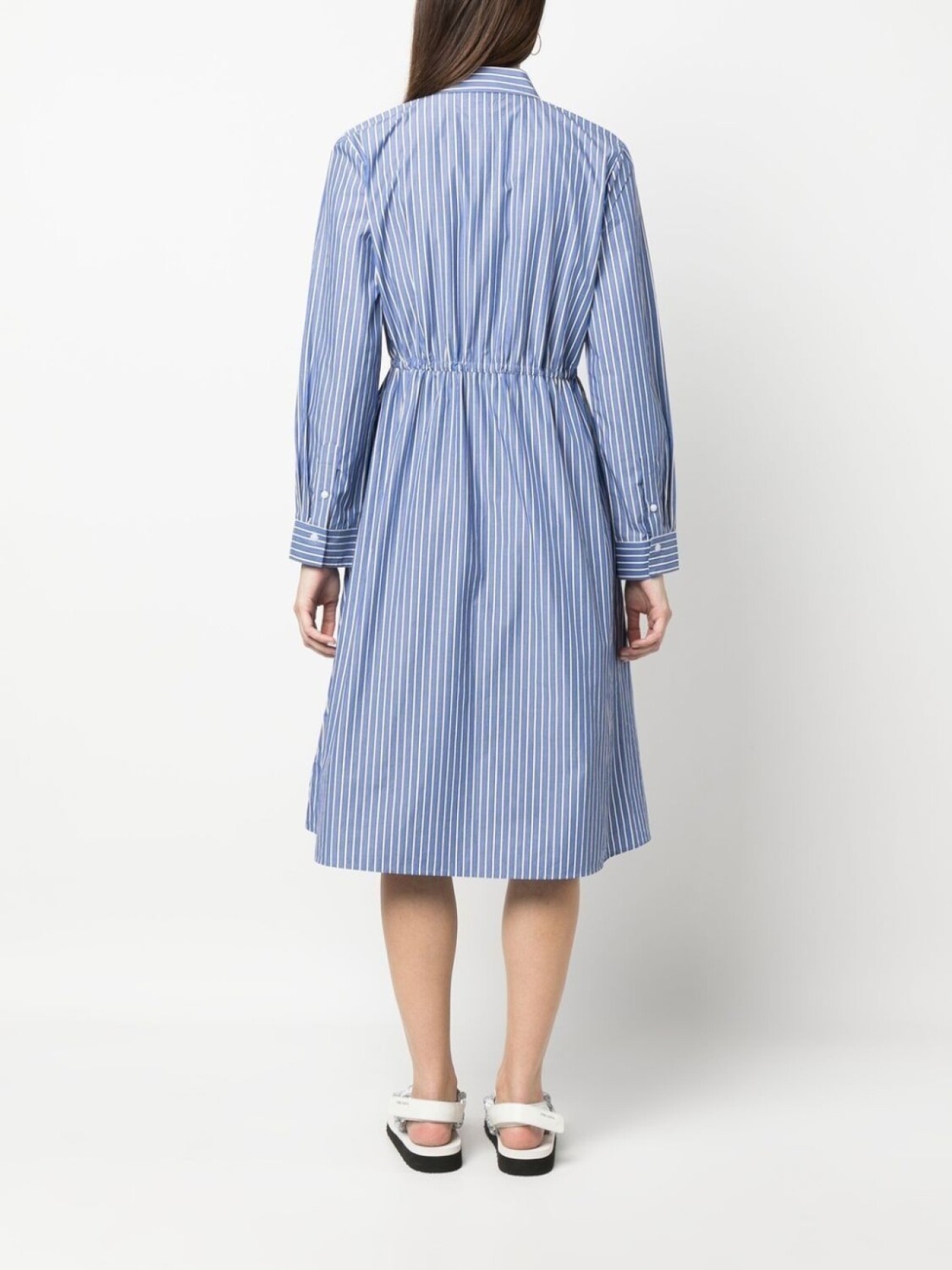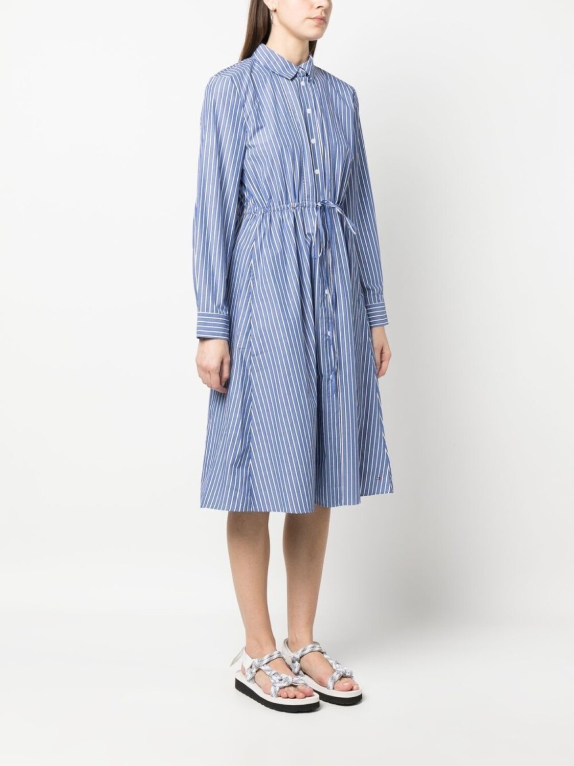 Синий, хлопок, узор в вертикальную полоску, серебристый металлический логотип, юбка А-образного силуэта, кулиска на талии, классический воротник, застежка на пуговицах спереди, длинные рукава, манжеты на пуговицах и прямой подол.