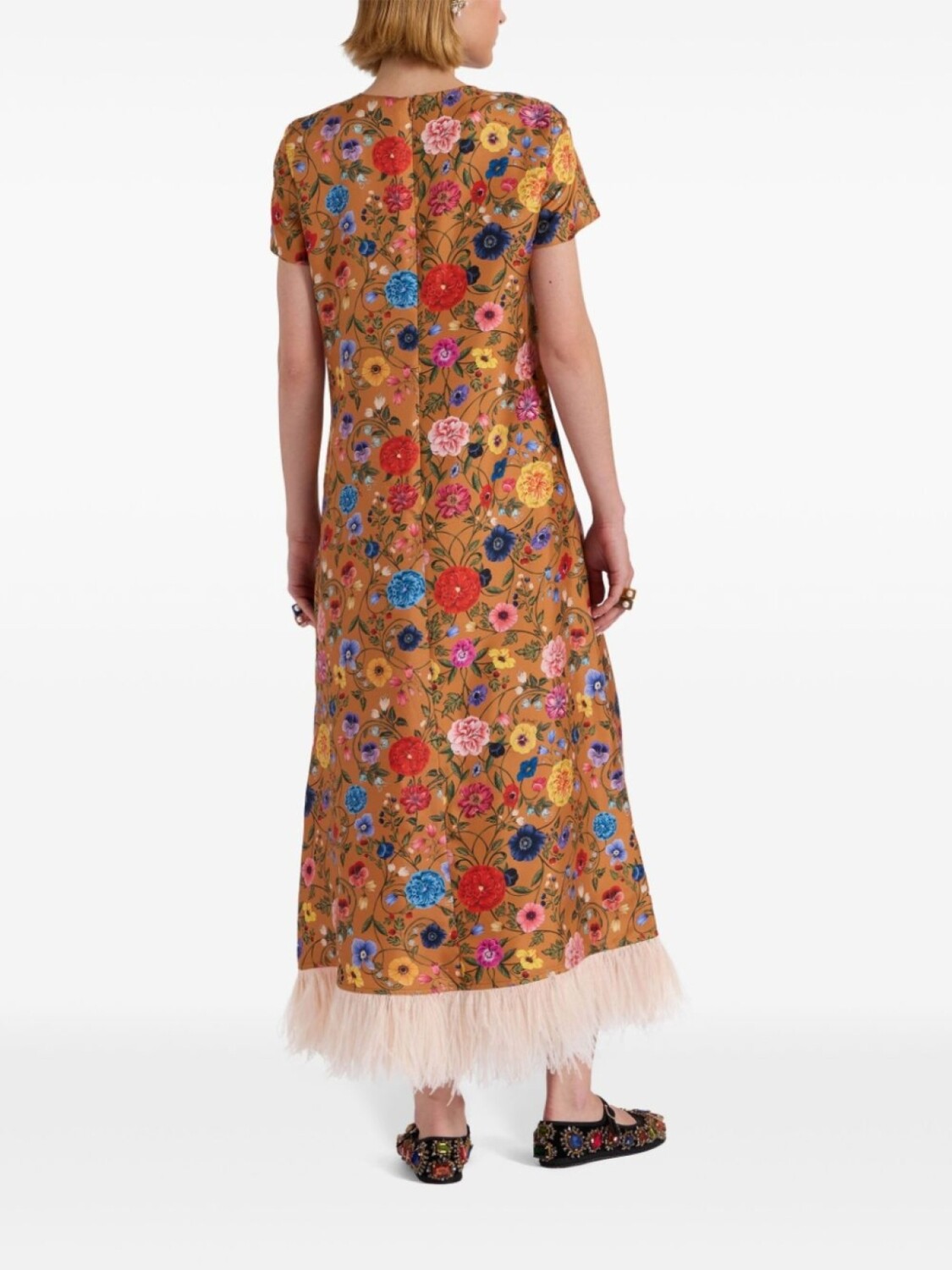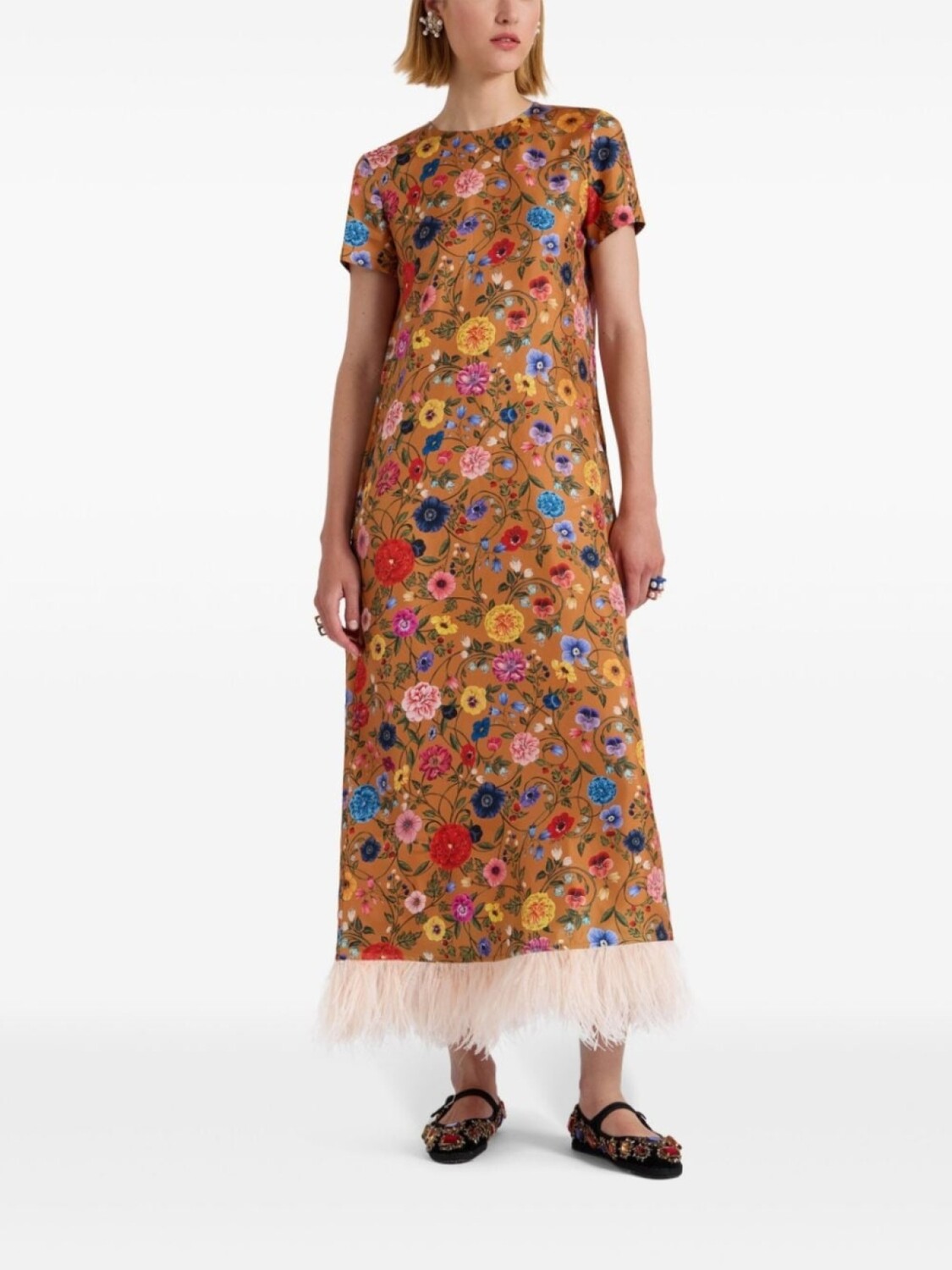 Коричневый/разноцветный, смесовый шелк, эффект металлик, потайная застежка на молнии сзади, сплошной цветочный принт, круглый вырез, короткие рукава, перья, прямой подол, длина макси