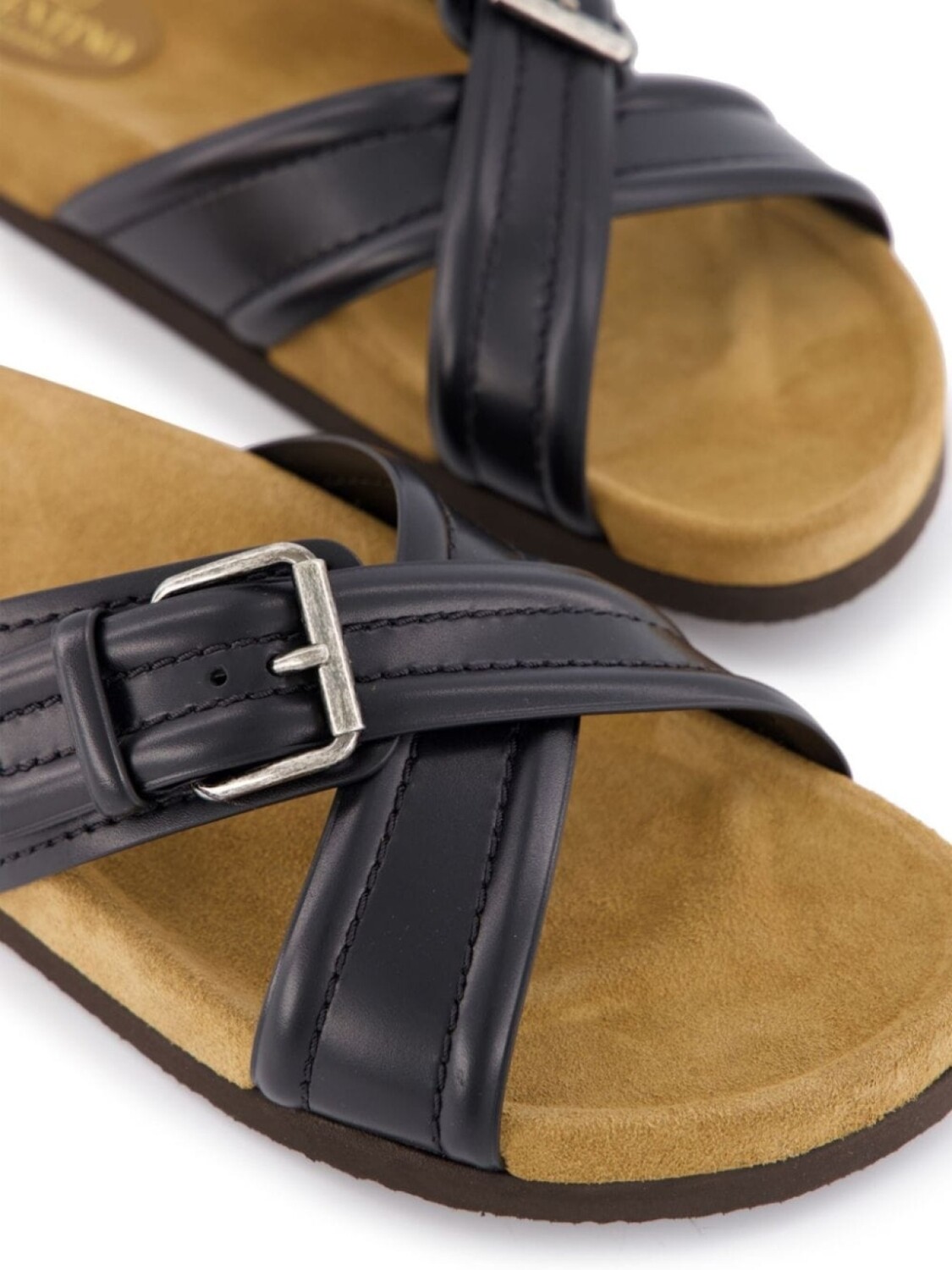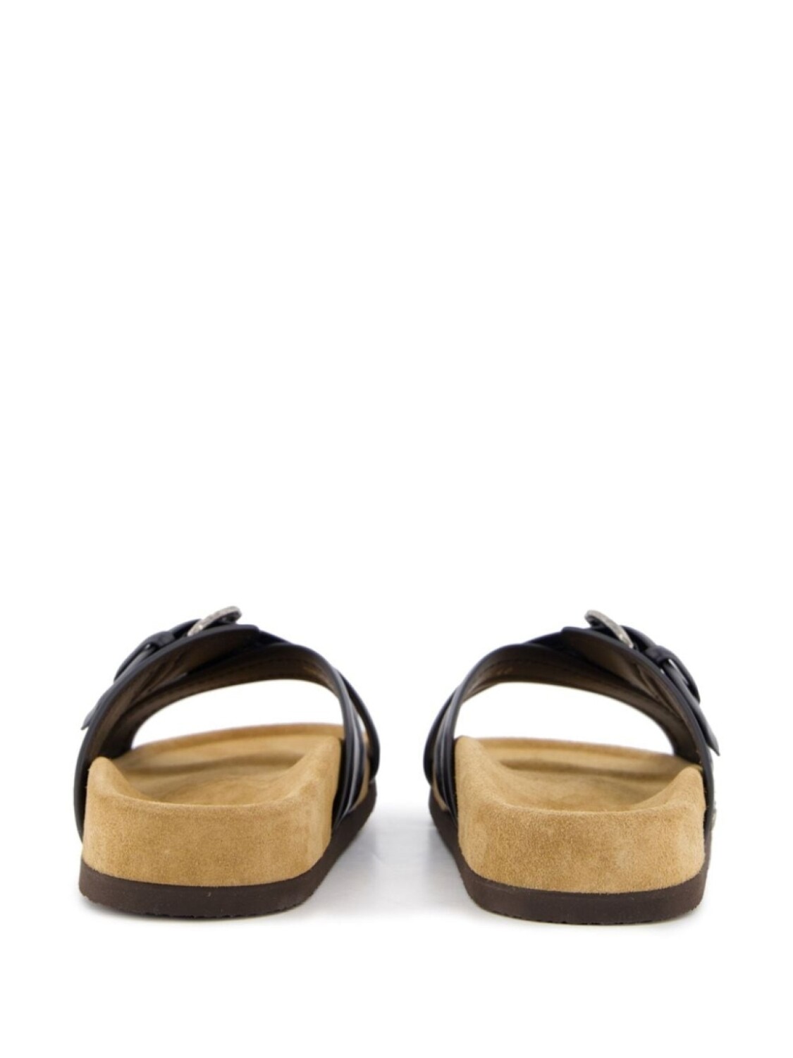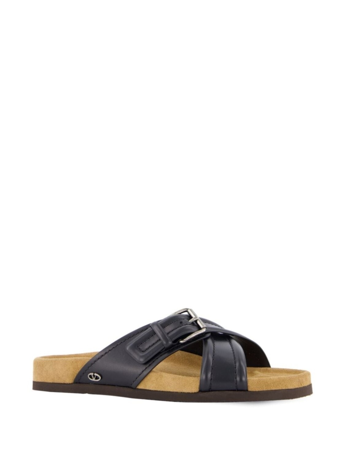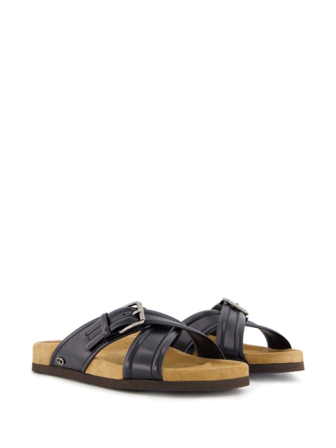 Черный, кожа, без застежки, металлический логотип, перекрестные ремешки, декоративная пряжка, закругленный открытый носок, формованная стелька, логотип на стельке, кожаная подошва
