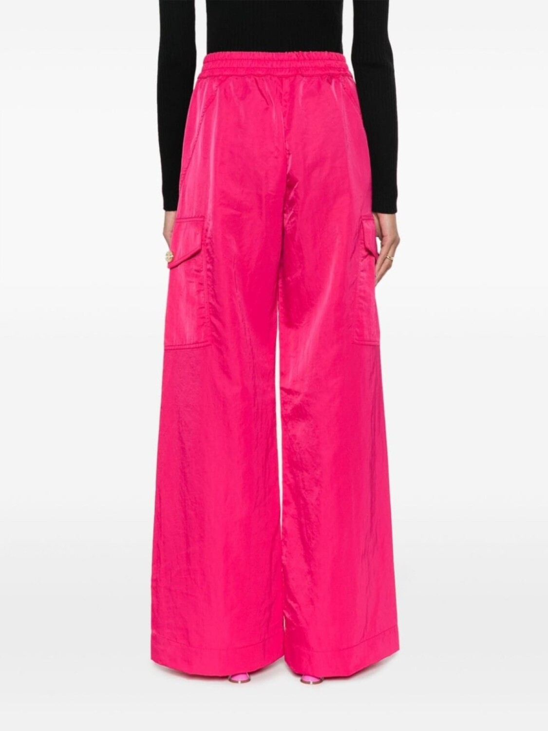 Фуксия, золотистые пуговицы с тиснением, широкий крой, эластичный пояс, два вшитых кармана по бокам и два накладных кармана по бокам.