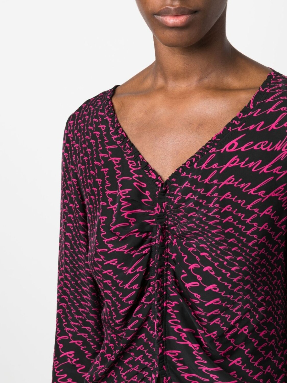 Черный, фуксия, сплошной принт с логотипом, V-образный вырез, детали с оборками, отделка с оборками, длинные рукава и разрез спереди.