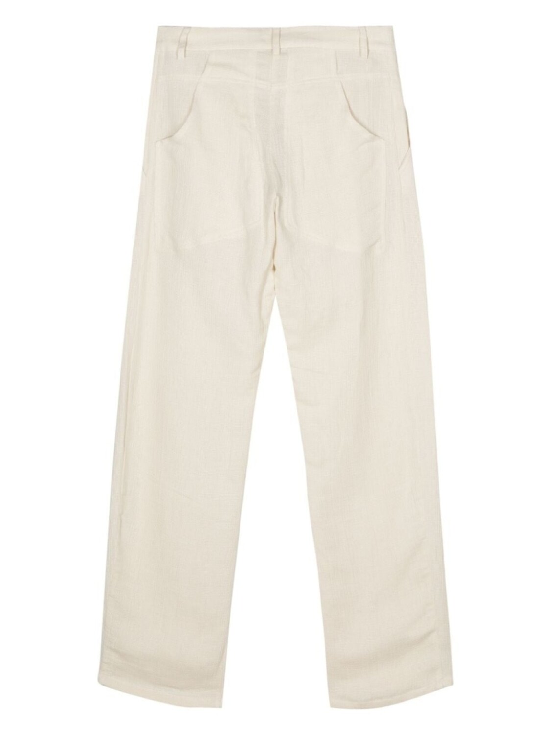 Экрю, смесь хлопка и льна, плетеный материал, петли для ремня, два кармана по бокам, декоративные швы, прямой крой, два накладных кармана сзади, потайная застежка на пуговицы, крючок и молнию спереди
