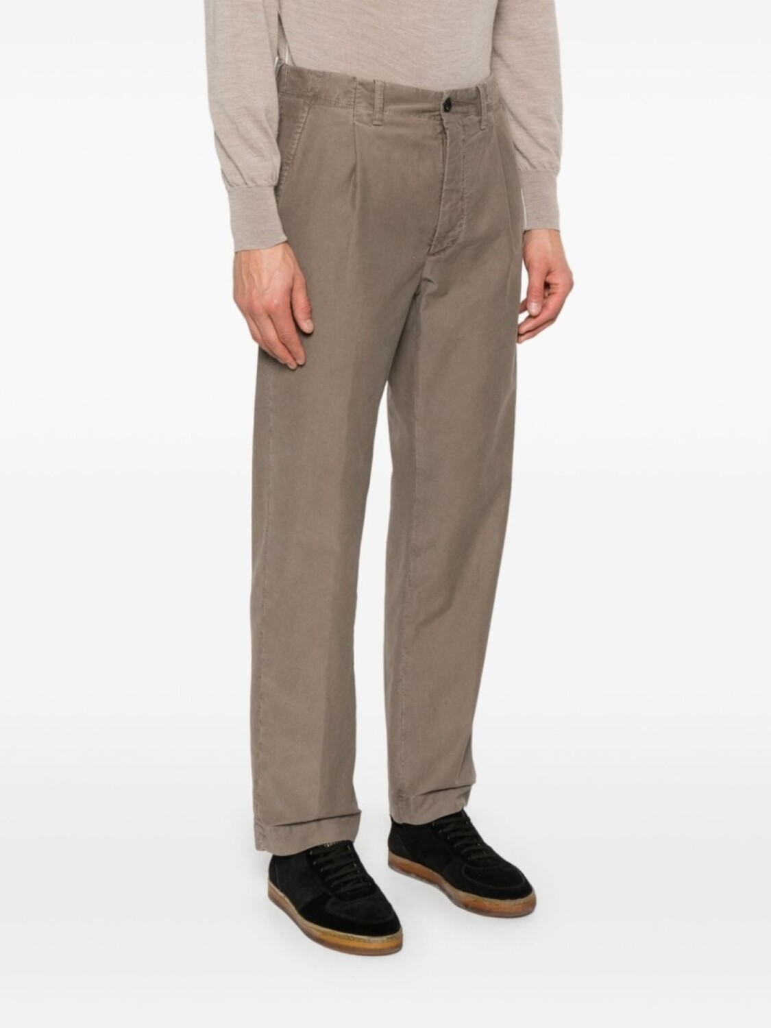 Серый, хлопок, ткань с твиловым переплетением, застежка на молнии и пуговице спереди, петли для ремня, складки, два прорезных кармана по бокам, стрелки, два кармана с клапанами по бокам, зауженный крой