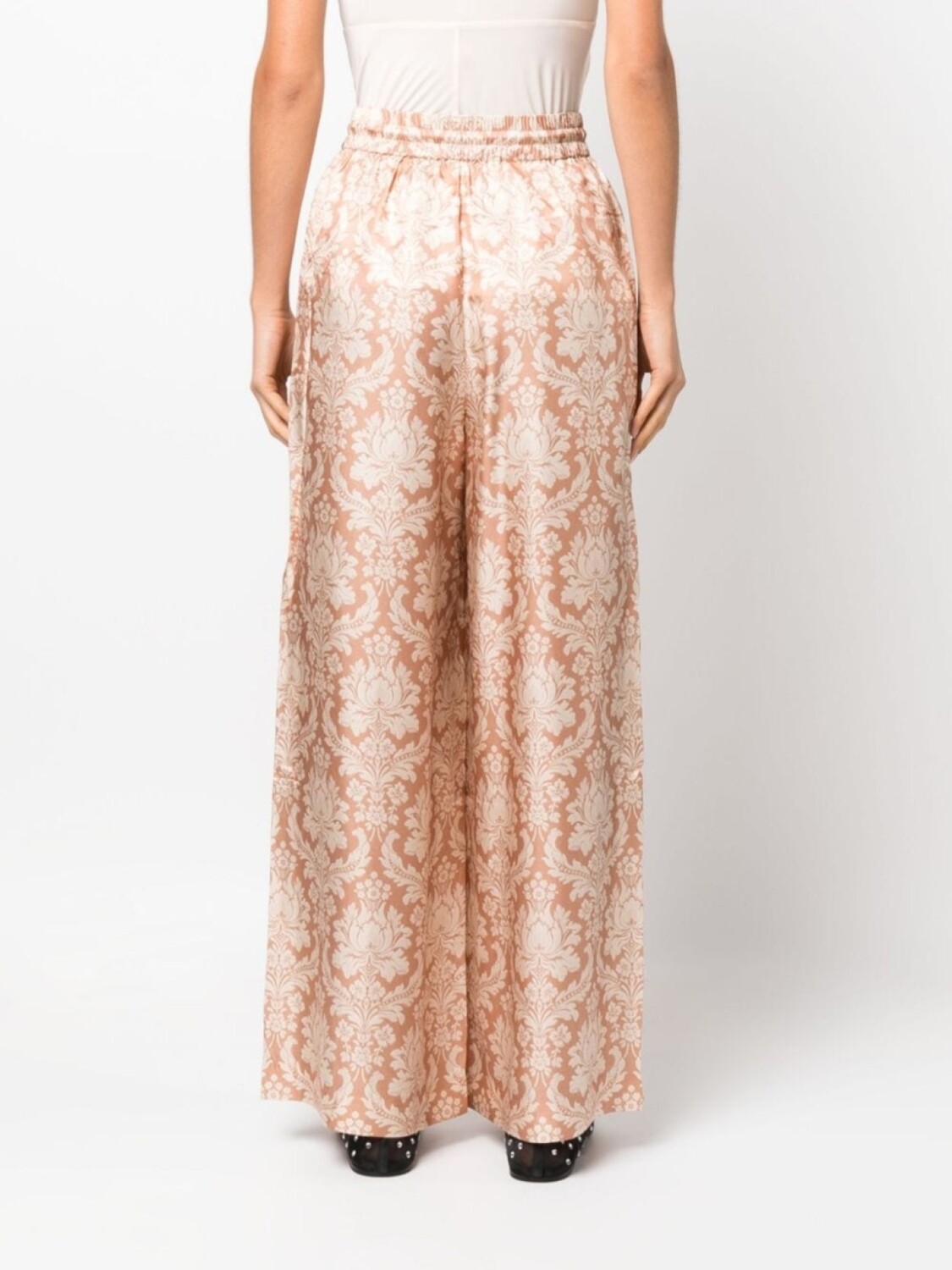 Розовый, бежевый, шелковый атлас, сплошной графичный принт, полоска сбоку, завышенная талия, кулиска на талии и широкий крой.