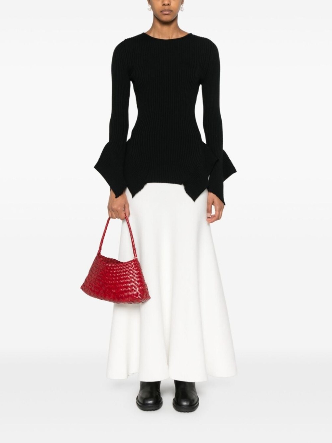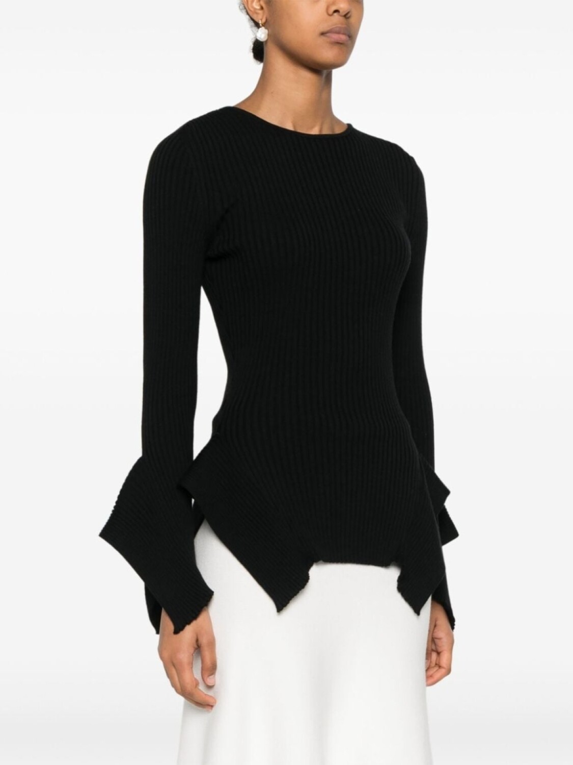 Черный, шерсть мериноса, трикотаж в рубчик, круглый вырез, длинные рукава, расклешенные манжеты, расклешенный подол